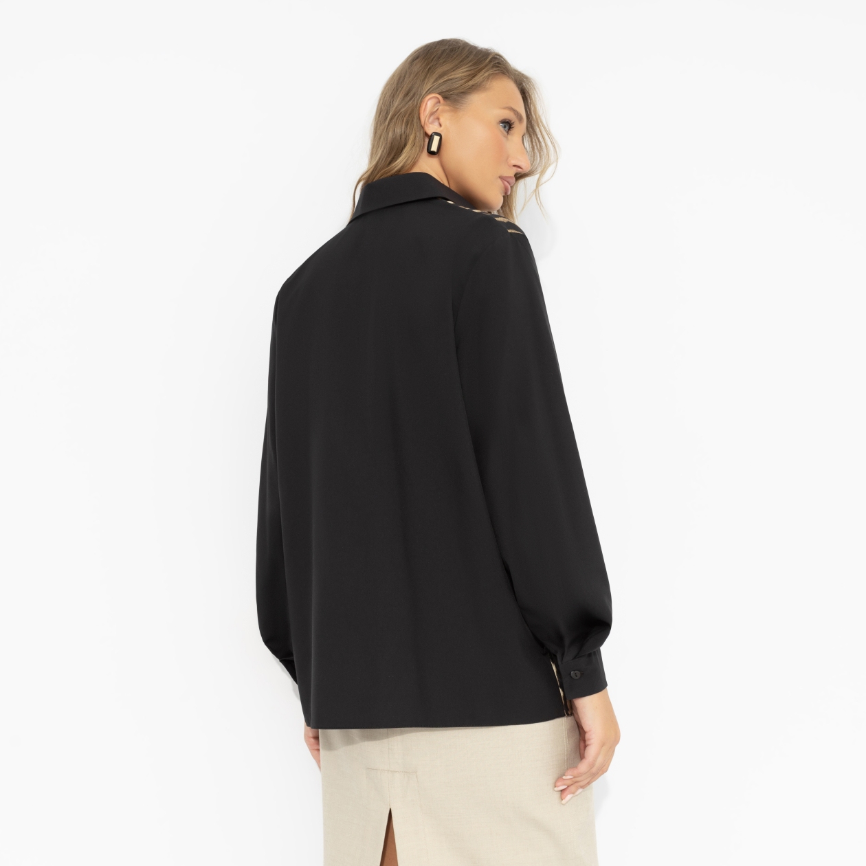 Мягкий атлас скользит по коже, ловя свет и внимание. Контраст фактур – гладкий шёлк и хищный леопард – создаёт настроение силы и притяжения. Теперь контроль полностью в твоих руках. Рубашка классического кроя на пуговицах. Хорошо смотрится в запревленном виде и навыпуск.