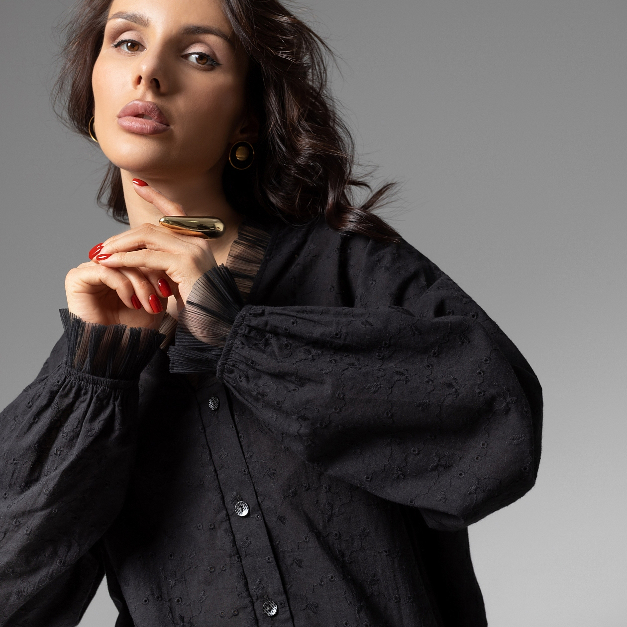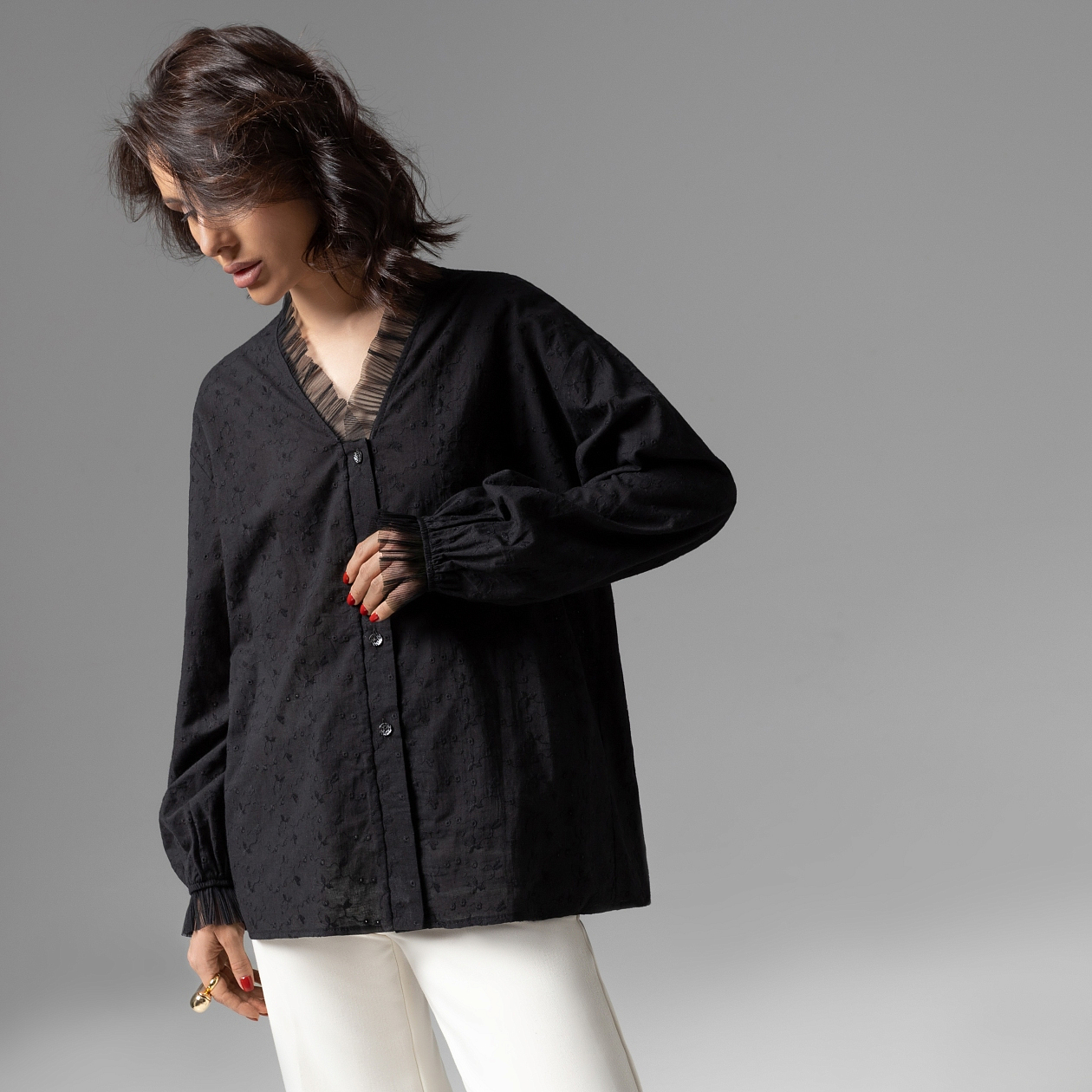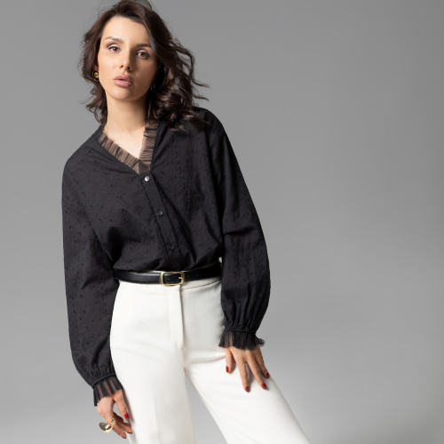 Гармония женственности и тайны. Черный цвет раскрывает глубину, а прозрачное шитьё на спинке добавляет интриги. Лёгкость ткани, свободный крой...за каждым вашим движением хочется следить. Стиль, который завораживает. Изделие застегивается на пуговицы. Акцентный прозрачный декор из крупного шитья по спинке изделия. Акцентный декор из сетки-гофре на манжетах и по вырезу. Высокий контроль качества пошива.