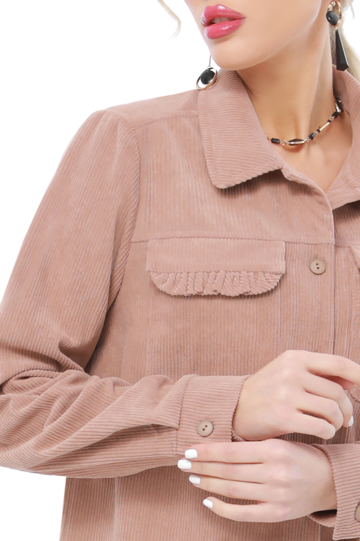 Вельветовая рубашка с акцентными карманами — универсальная вещь, которая поможет создать множество модных образов как на каждый день, так и в офис. Отложной воротничок, лаконичные пуговицы в тон, длинные рукава с манжетами и стандартная длина приближают модель к классической, элегантной сорочке, что позволяет без труда вписать ее в гардероб. Отличительная черта рубашки это не только приятный на ощупь микровельвет, но и накладные карманы, которые украшены рюшами. Эта изюминка придает изделию женственные, игривые нотки и делает ее более нарядной. Теплую, удобную рубашку можно носить как в качестве самостоятельного элемента гардероба, так и в виде верхнего слоя — наподобие куртки или жакета. В обоих случаях модель из вельвета будет выглядеть дорого и стильно. Качественный, плотный и мягкий материал хорошо сохраняет тело и дарит ощущение уюта. Рекомендуем стирать в деликатном режиме.