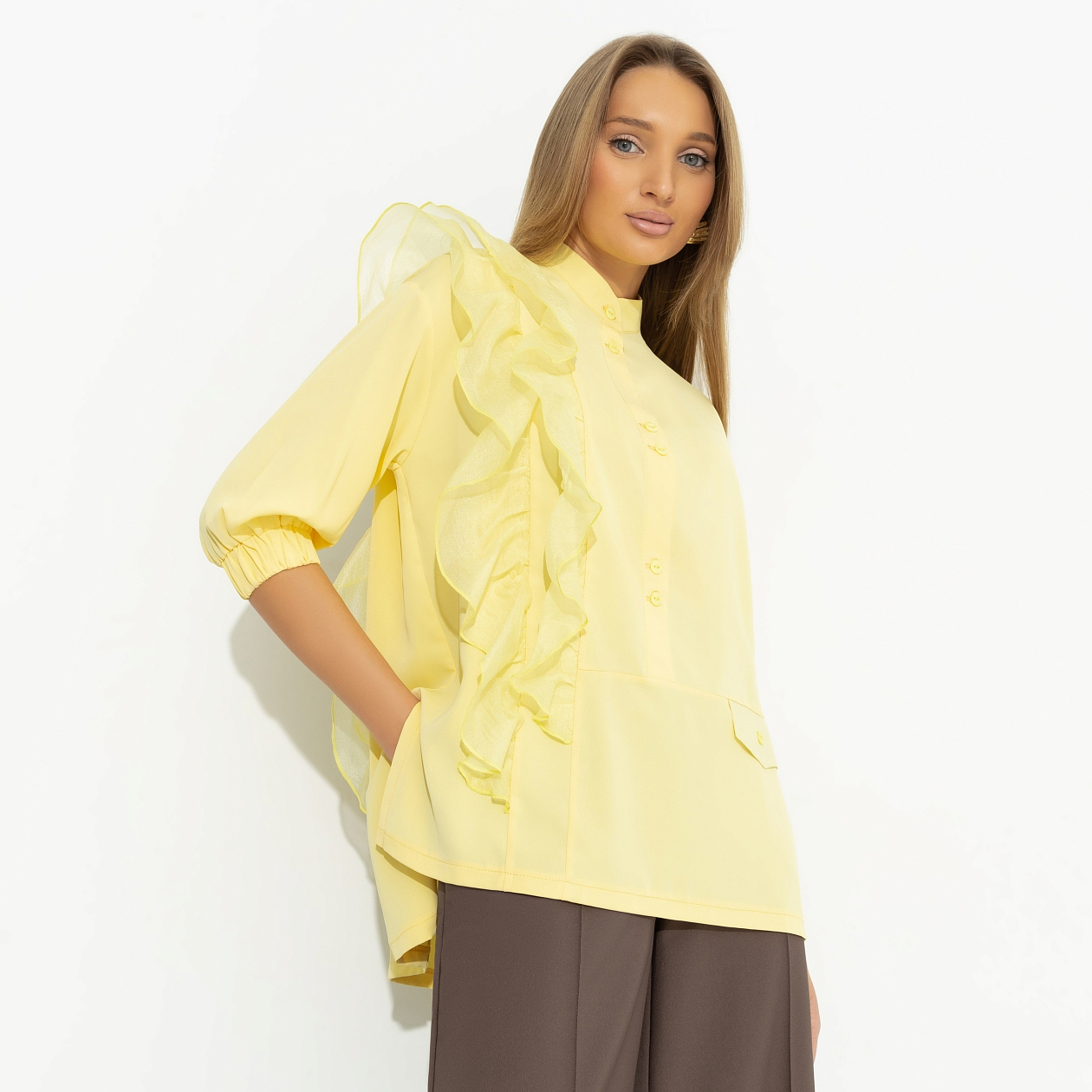 Пусть ваша жизнь будет наполнена солнечным светом, даже если на улице пасмурно. За хорошее настроение отвечает ваш настрой и ваш образ. В рубашке CHARUTTI в сочном оттенке все хорошо будет не только у вас, но и у всех, кого вы встретите. Рубашка прямого силуэта. Рука укорочен, оформлен скрытой резинкой. Асимметричный декор в виде объемных рюш по передней и задней стороне изделия. Имитация кармана с одной стороны изделия.