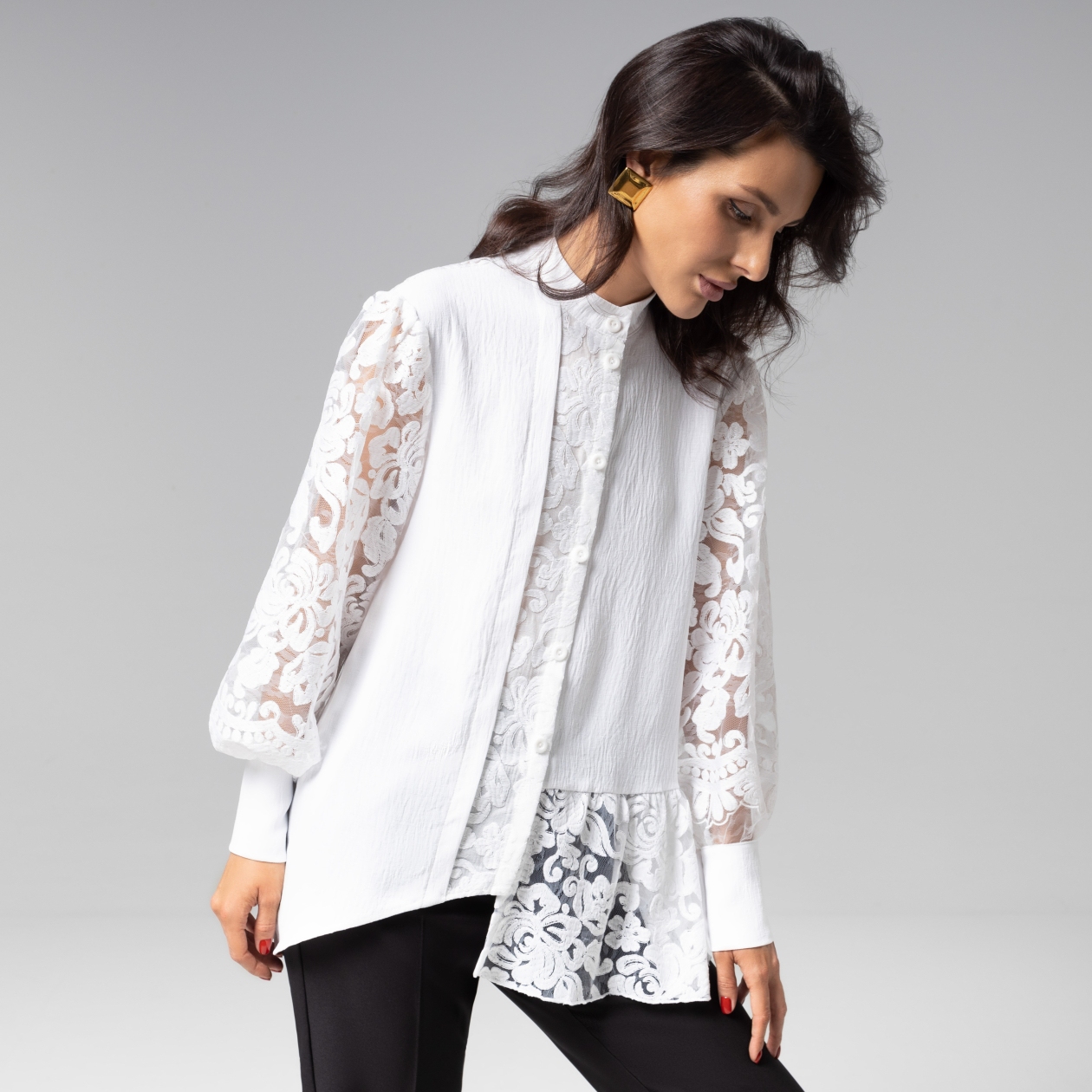 Рубашка ЧАРУТТИ – воплощение гармонии контрастов. Жатая ткань с благородной текстурой сочетается с воздушным кружевом премиального качества, создавая эффект баланса между строгостью и романтикой. Сложный крой с воротником-стойкой и асимметричными рельефами подчеркивает архитектурность силуэта. Рубашка сохраняет элегантную фактуру даже после долгого дня, а кружево, сотканное из тончайших хлопковых нитей, не теряет нежную форму. Кружевные вставки с флорентийским узором на объемных полупрозрачных рукавах добавляют воздушности.
