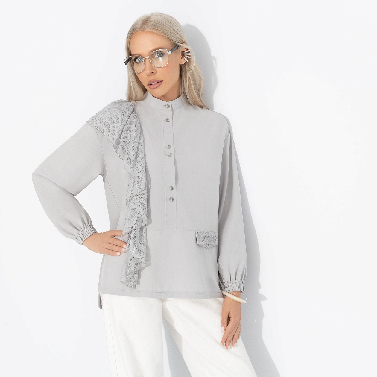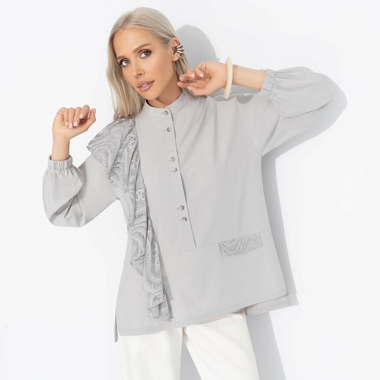 Блуза от CHARUTTI всем своим видом желает вам продуктивной недели. Пусть дни будут свободными, как крой этой блузы и наполнены нежностью кружева. Пусть выходные будут удлиненными, как фасон изделия и в каждом дне будет место маленькой, как пуговица блузы, радости. Блуза свободного кроя. Воротник-стойка. Манжеты рукавов оформлены скрытой резинкой. Акцентное тонкое кружево с двух сторон изделия – по передней стороне и по спинке. Имитация кармана с одной стороны блузы.