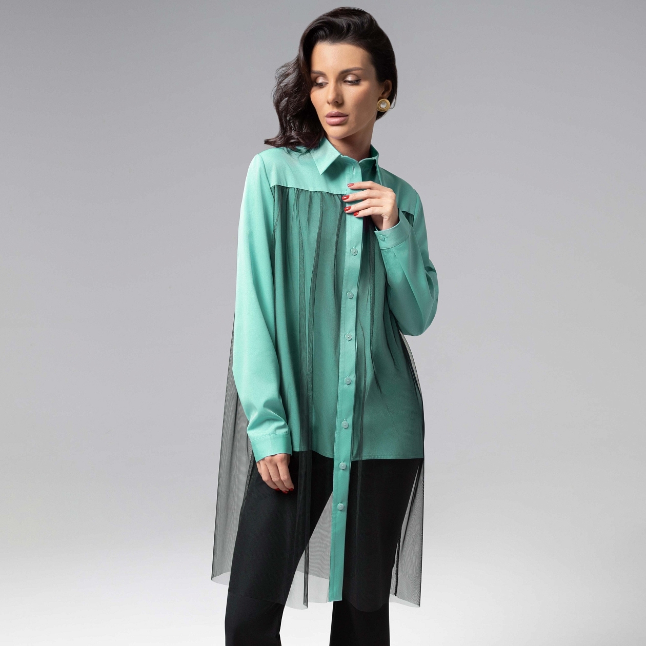 Классическая рубашка? Да ну, забудьте. Эта рубашка не просто одежда – она ваш PR-менеджер. Бирюза, лёгкость сетки и строгий крой слились в идеальное трио. В этой рубашке легко поверить: обложка журналов ждёт именно вас. Акцентная деталь из тонкой сетки придает образу лёгкость и утонченность, сохраняя при этом благородную сдержанность кроя. Рубашка удлиненная.
