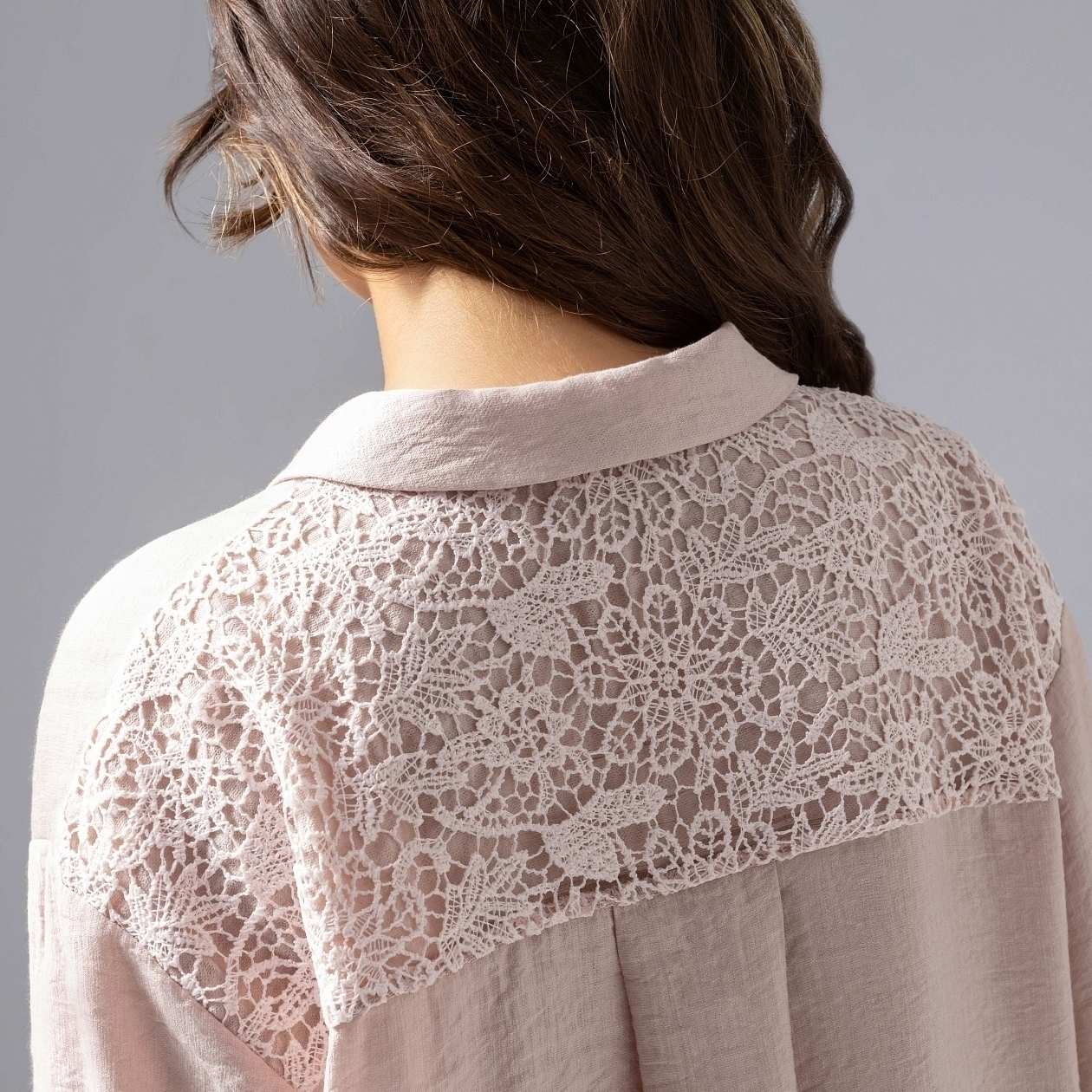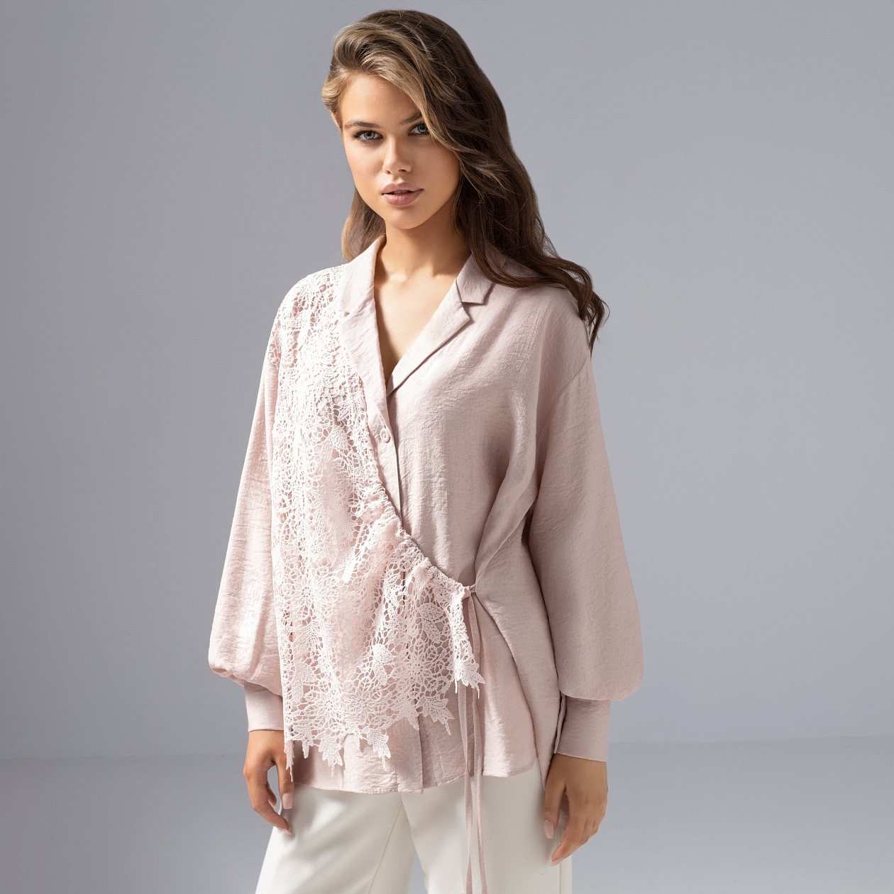 Если бы Мэттью Уильямс из Givenchy творил для ЧАРУТТИ, он бы сочетал пастель и причудливое кружево именно так: мягкость, асимметрия, акцент на фактуру. Не удивляйтесь, если получите комплимент от фэшн-эксперта – такую рубашку оценили бы стилисты со всего мира. Рубашка из премиальной блузочной ткани «фаби», воздушное сочетание 50% вискозы, хлопка и нейлона. Выразительное кружево и сложный продуманный крой способны преобразить образ за секунду. Для любительниц продуманной и нескучной элегантности.