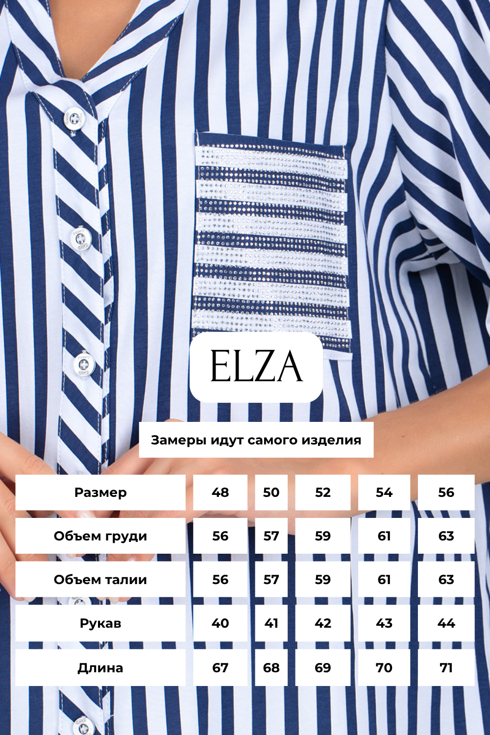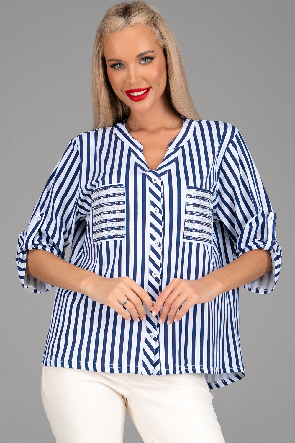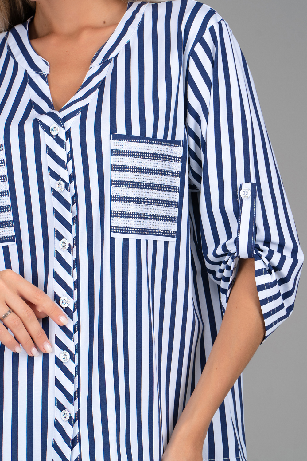 Представляем вам рубашку, идеальную для летнего сезона. Она выполнена из лёгкой ткани с вертикальными полосками в классическом сочетании белого и тёмно-синего цветов. Модель имеет свободный крой и застёгивается на белые пуговицы спереди. Интересной деталью являются два накладных кармана на груди с горизонтальными полосками, создающими контраст с основным узором. Рукава длиной 3/4 с оригинальными разрезами и хлястиками на пуговицах, которые позволяют регулировать длину и стиль. Вырез — V-образный с мягким переходом в воротник-стойку. Рубашка отлично подойдёт как для повседневного, так и для офисного образа.