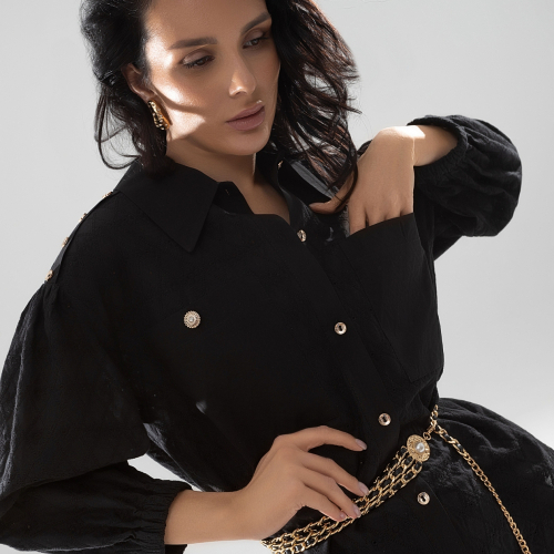 Рубашка «Пик элегантности (super black, с поясом)» способна покорить даже тех, кто привык к классическим цветам и приталенным фасонам. Её уникальная комбинация раскованности и утонченности делает её превосходным выбором для оптовых закупок-магазинов, специализирующихся как на повседневной моде, так и на вечерней. Золотистая фурнитура привносит в образ сияние и гонит прочь скуку, внося нотки престижа и гламура. Бытует мнение, что великое искусство — это умение всегда быть вне времени. Эта рубашка — отличный пример такого искусства. Ваши клиенты будут вам благодарны за возможность прикоснуться к подлинной модной магии, и вы насладитесь потрясающим потоком покупательского интереса.