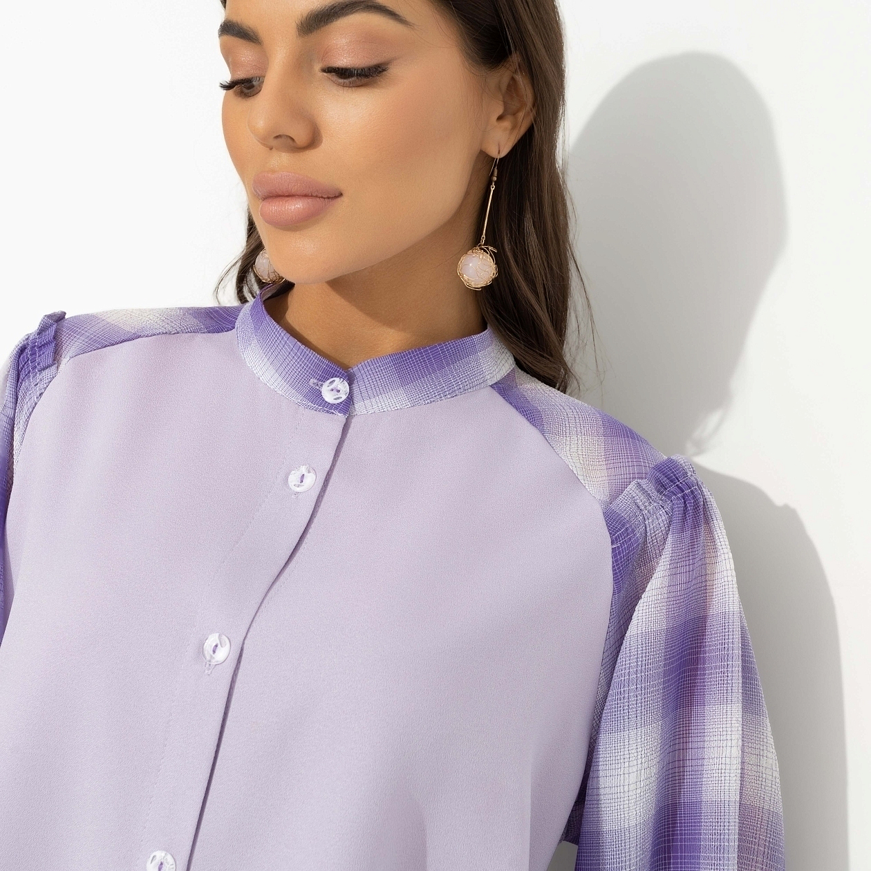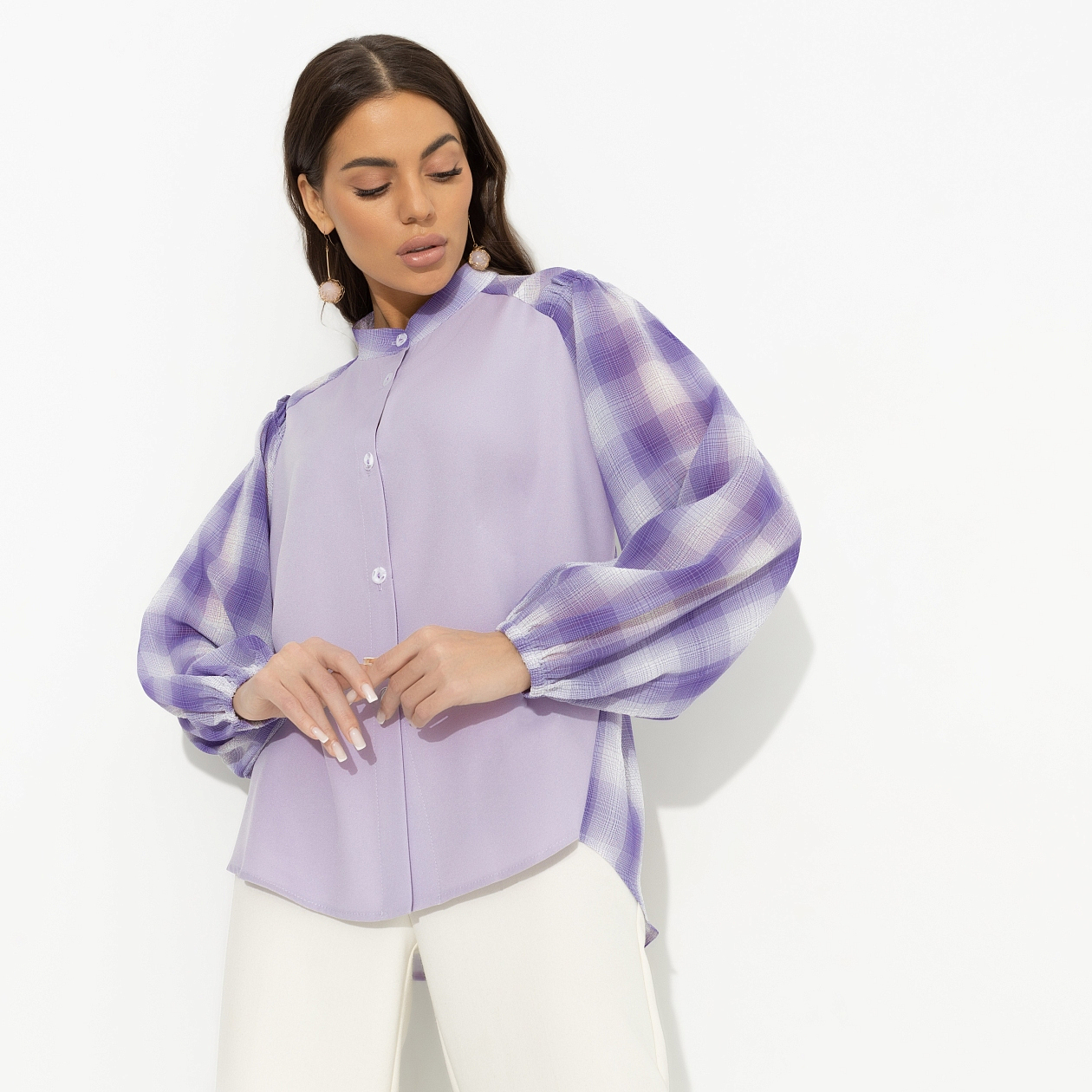 «На сиреневой луне ты забудешь обо всем…», – поет непревзойденный Леонид Агутин. Ты уже знаешь наизусть его песни и готовишься встретиться лично. Конечно же, на его концерте. Блуза CHARUTTI как логичное дополнение к вечному хиту. Блуза свободного силуэта. Рукав свободный, оформлен тонкой резинкой. Изделие застегивается на пуговицы. Деликатные рюши на плечах блузы в качестве декора.