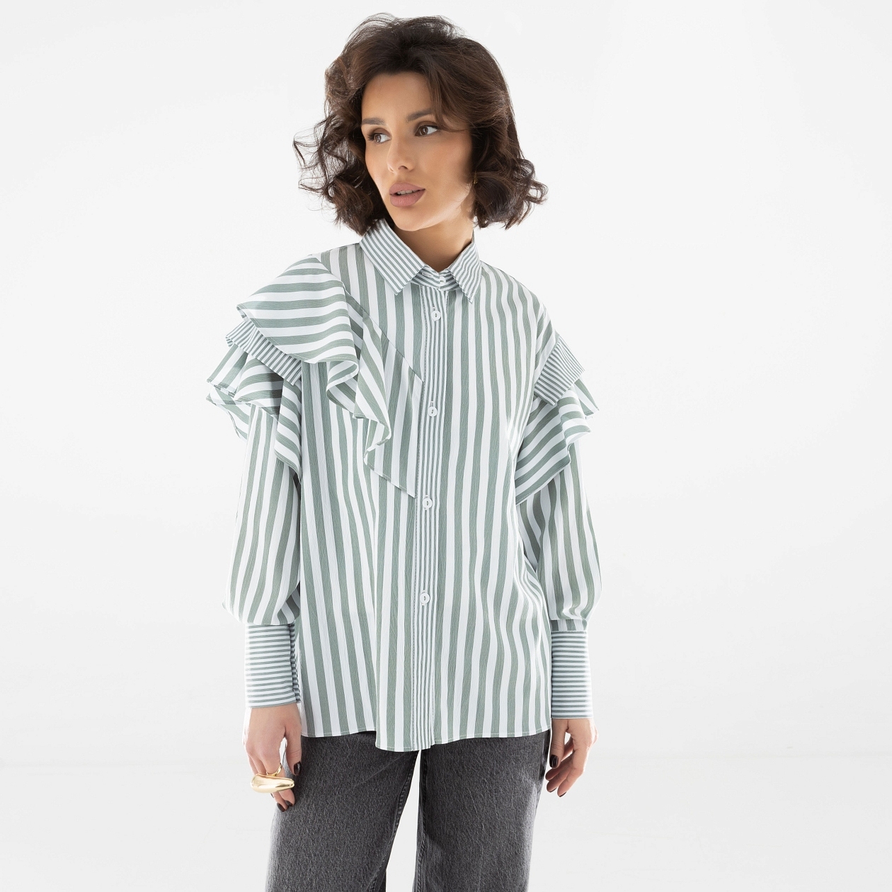 Взяв за основу классическую рубашку в полоску, дизайнеры CHARUTTI вывели её за пределы офисного стиля за счет объемного декора. Рюши делают образ слегка игривым, что не мешает стилизовать рубашку в casual луках. Рубашка свободного кроя. Объемный асимметричный декор с двух сторон изделия. Застегивается на пуговицы.