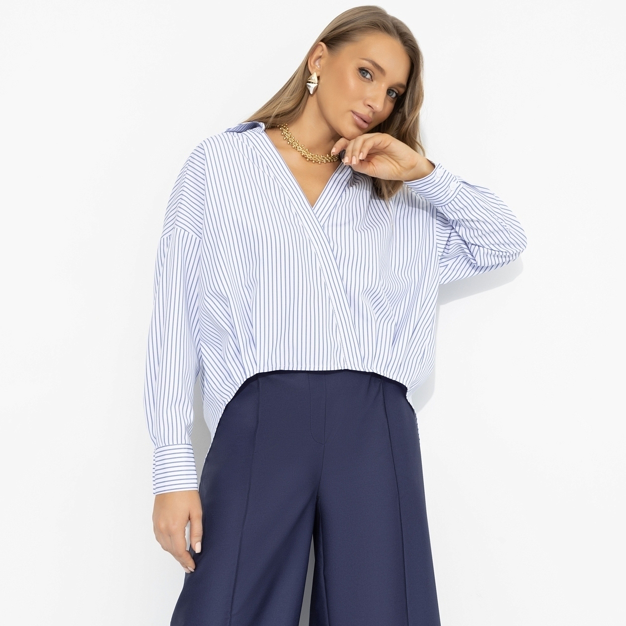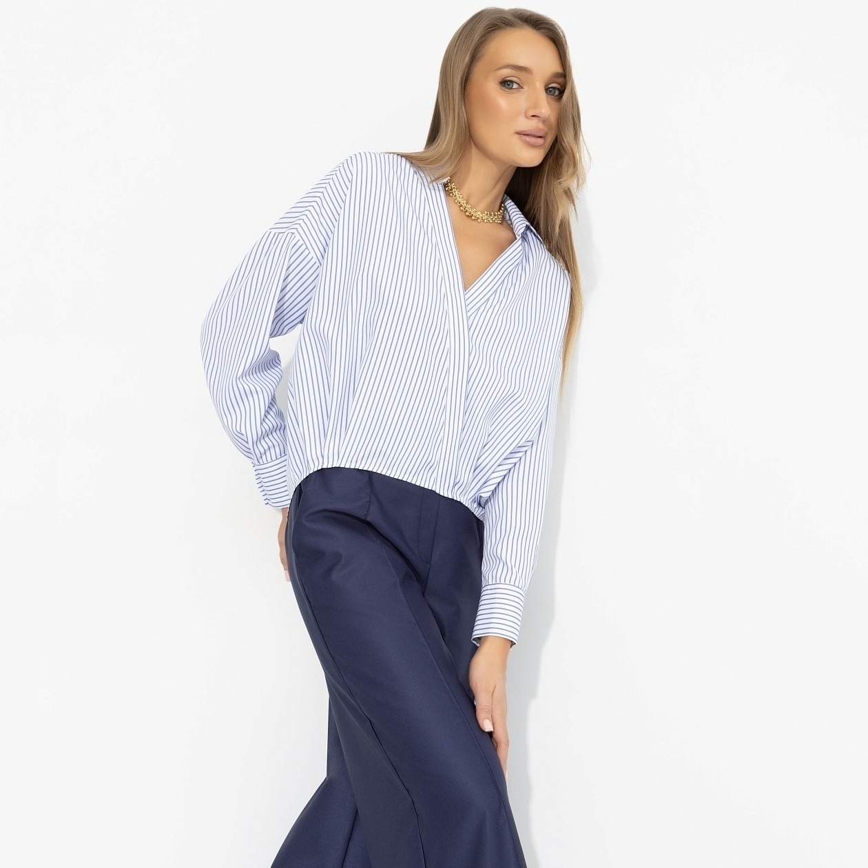 Она умеет договариваться – но только на своих условиях. Голубая полоска в этой модели звучит свежо и интеллектуально, как у The Row: ничего лишнего, только выверенный крой. Свободная посадка, спущенная линия плеча, мягкий объём рукавов и удлинённая спинка создают расслабленный силуэт. Тренд на офискор здесь читается тонко – строго, но с характером.