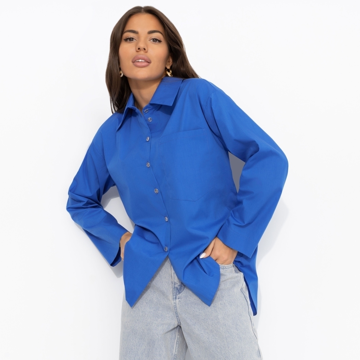 Ломай стереотипы! Ты и красивая, и умная, и успешная. В рубашке ЧАРУТТИ гордо-синего цвета ты наслаждаешься своими преимуществами, а не стесняешься их. Потому что настоящий успех не терпит полутонов. Рубашка свободного кроя. Акцент в виде металлической цепи со стразами по спинке изделия. Есть треугольный вырез на спинке. Рубашка хорошо пропускает воздух за счет качественного материала и свободной посадки. Есть карман на передней стороне изделия.
