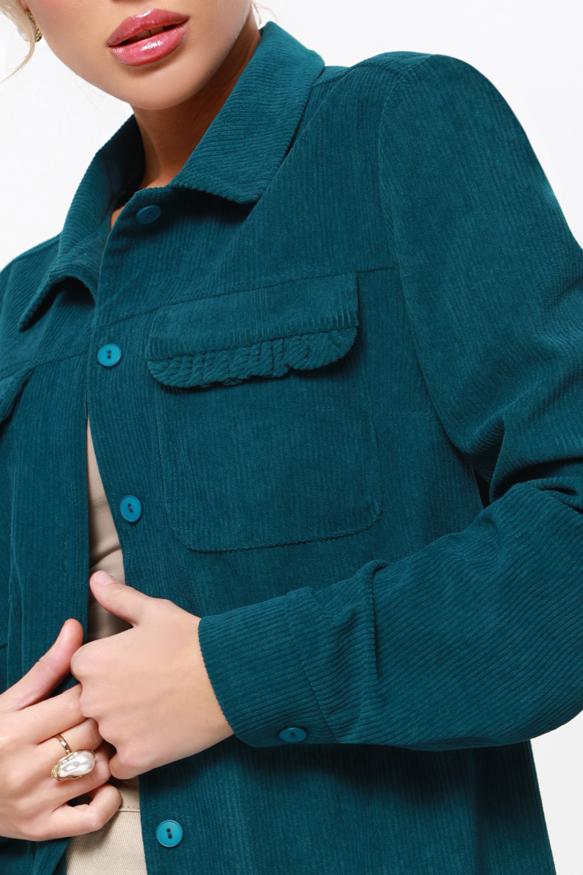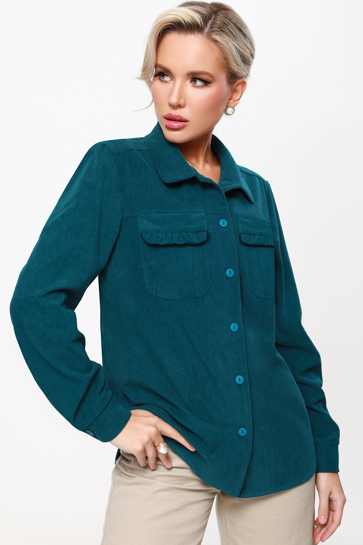 Вельветовая рубашка с акцентными карманами — универсальная вещь, которая поможет создать множество модных образов как на каждый день, так и в офис. Отложной воротничок, лаконичные пуговицы в тон, длинные рукава с манжетами и стандартная длина приближают модель к классической, элегантной сорочке, что позволяет без труда вписать ее в гардероб. Отличительная черта рубашки это не только приятный на ощупь микровельвет, но и накладные карманы, которые украшены рюшами. Эта изюминка придает изделию женственные, игривые нотки и делает ее более нарядной. Теплую, удобную рубашку можно носить как в качестве самостоятельного элемента гардероба, так и в виде верхнего слоя — наподобие куртки или жакета. В обоих случаях модель из вельвета будет выглядеть дорого и стильно. Качественный, плотный и мягкий материал хорошо сохраняет тело и дарит ощущение уюта. Рекомендуем стирать в деликатном режиме.