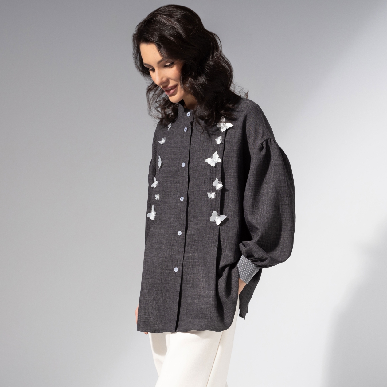 Сдержанный серый в новой интерпретации – благородный, с фактурным блеском и поэтичной лёгкостью. Рубашка ЧАРУТТИ будто вдохновлена атмосферой осеннего Парижа: немного туманно, безупречно, изысканно. Модель выполнена из ткани «лерис» с отделкой из сетки на манжетах. Свободный силуэт, застёжка на пуговицы по планке. Ткань устойчива к деформации, мягко ложится по фигуре. Модель дополнена объемным декором.