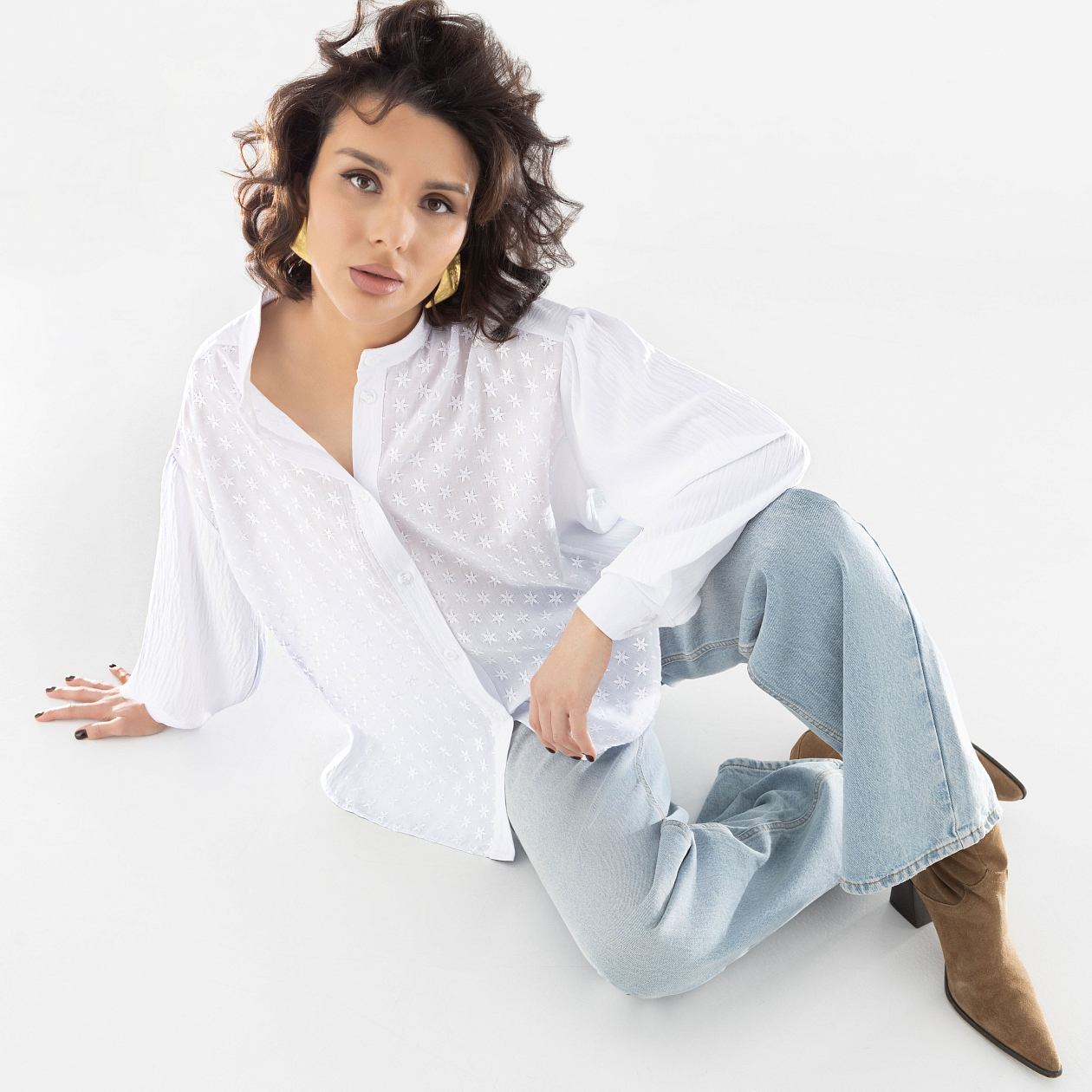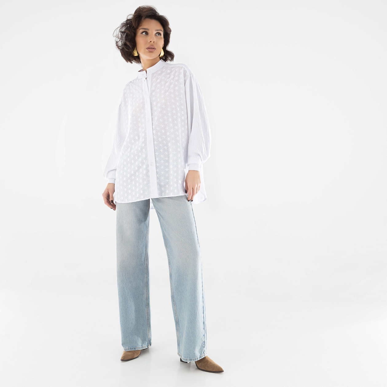 Эта изысканная рубашка из полупрозрачной ткани «Ценю внимание (new)» станет незаменимой частью вашего гардероба. Сочетание хлопкового материала с фактурой «поплин жатка» и «поплин вышивка» придает ей особую элегантность и универсальность. Независимо от того, ищете ли вы джинсовую рубашку женскую для повседневного образа или рубашку белую женскую для официальных мероприятий, эта модель идеально впишется в любой стиль. Благодаря свободному крою и легкому просвечиванию ткани, рубашка женская подчеркивает вашу утонченность и вкус, создавая изысканный образ.