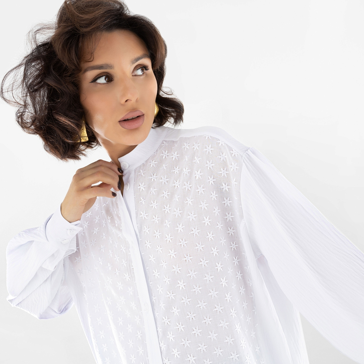 Рубашка из хлопка совершенно точно подружится и с вещами из офисного гардероба, и с неформальной одеждой. Элегантная база любого гардероба. Модель сшита из фактурного материла. Рубашка свободного кроя, ткань слегка просвечивает. Застегивается на пуговицы в тон изделия. Воротник-стойка.