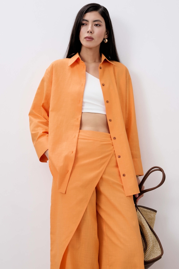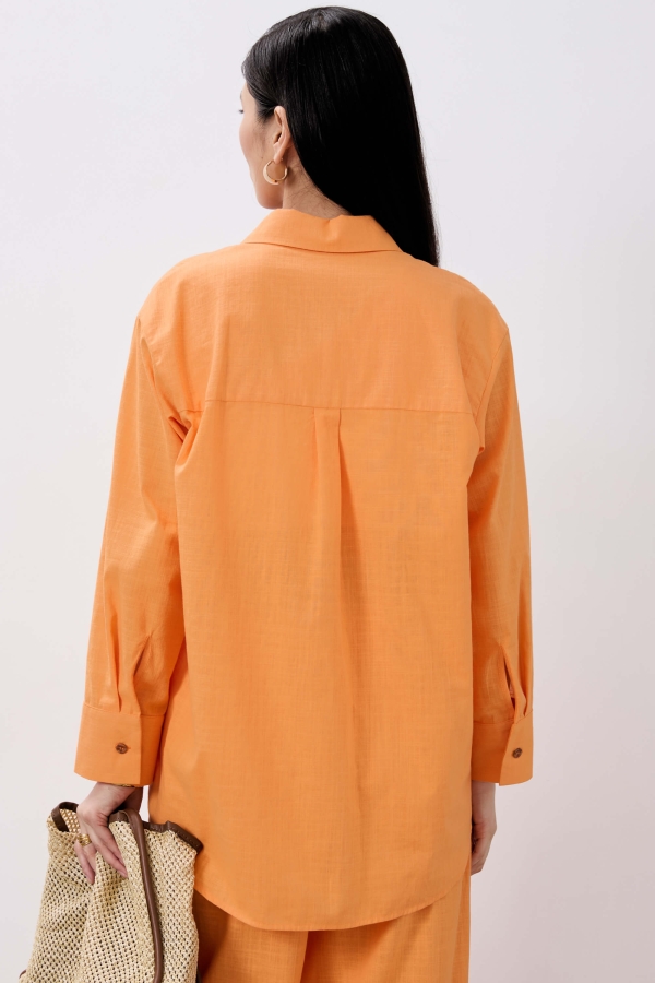 Свободная рубашка из фактурного хлопка со спущенной линией плеча. Воротник рубашечный. Длинный рукав с широкой манжетой. По спинке отрезная кокетка со складкой. Низ изделия фигурный.