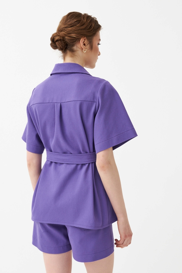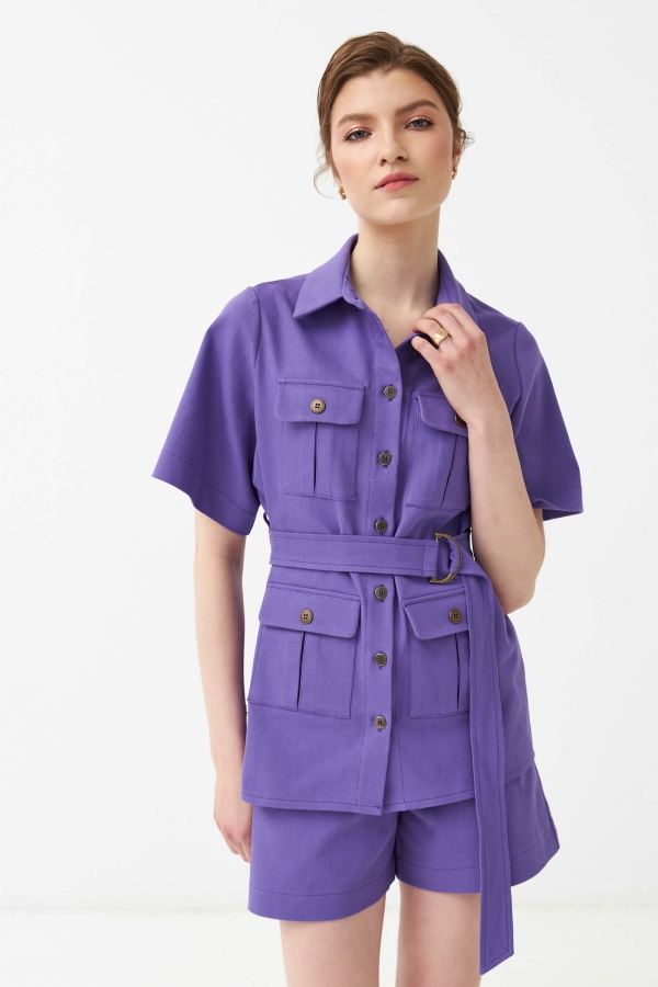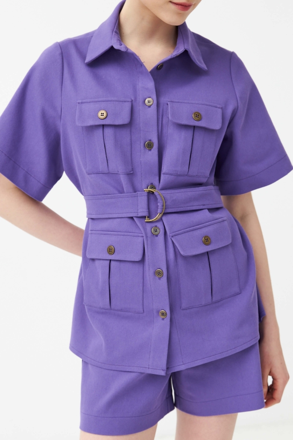 Рубашка из джинсы премиум качества. Рубашка свободного силуэта. По переду накладные карманы со складкой и клапанами, функциональная застежка на петли и пуговицы. Воротник отложной со стойкой. По спинке кокетка со складкой. В комплекте пояс из основной ткани с металлической пряжкой, в боковых швах шлевки.