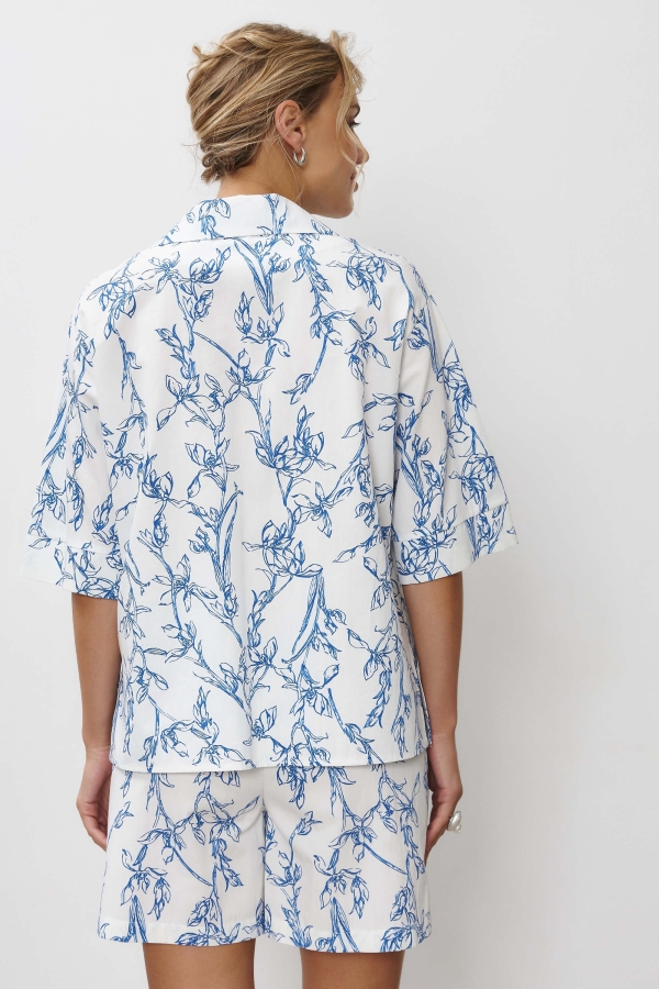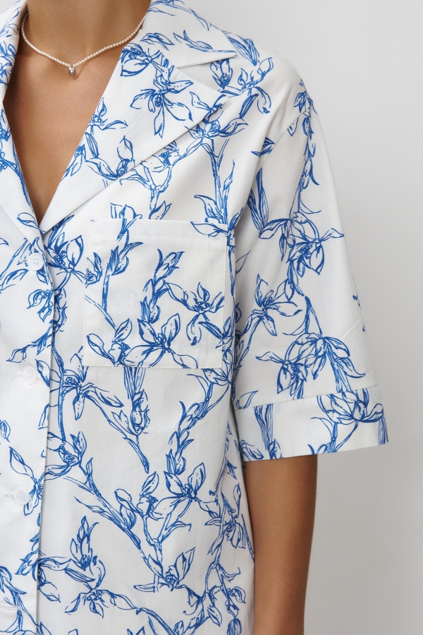 Рубашка из хлопка с эксклюзивным принтом. Модель свободного силуэта с английским воротником. Рукав спущенный, свободный с декоративной манжетой. По переду застежка на петли пуговицы. В боковых швах разрезы.