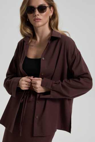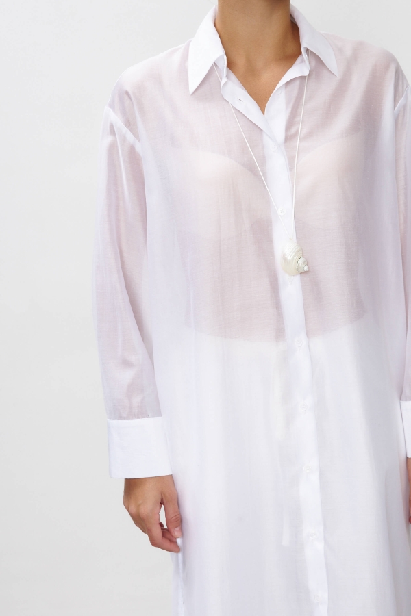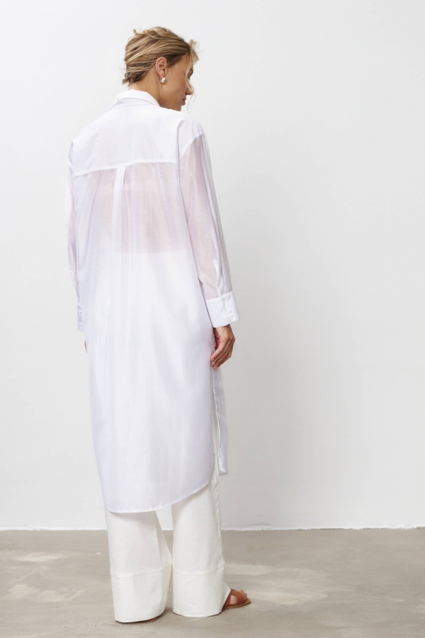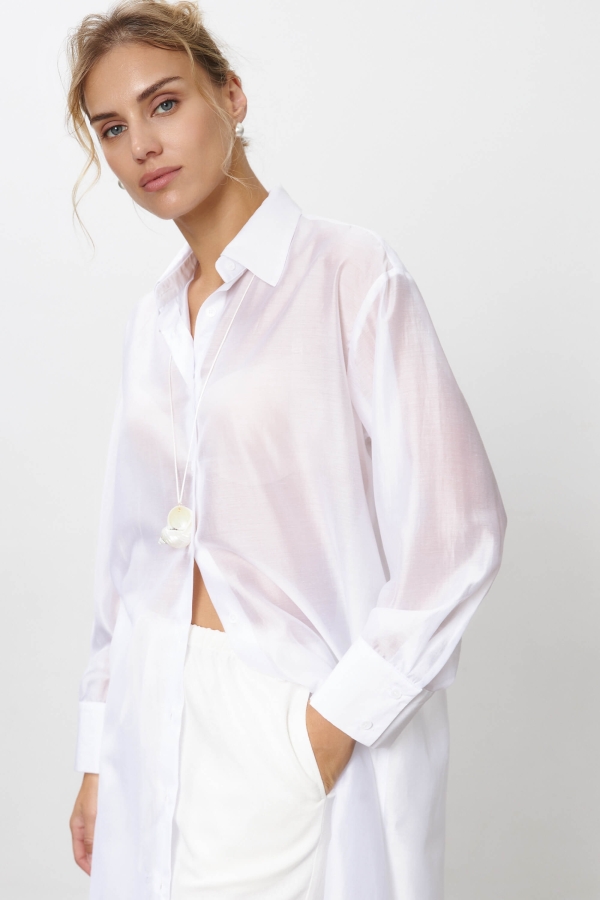 Трендовая рубашка-туника из воздушной, вискозной органзы вуаль. Модель свободного силуэта. Удлиненная модель дополнена фигурной линией низа и разрезами. По спинке кокетка со складкой.
