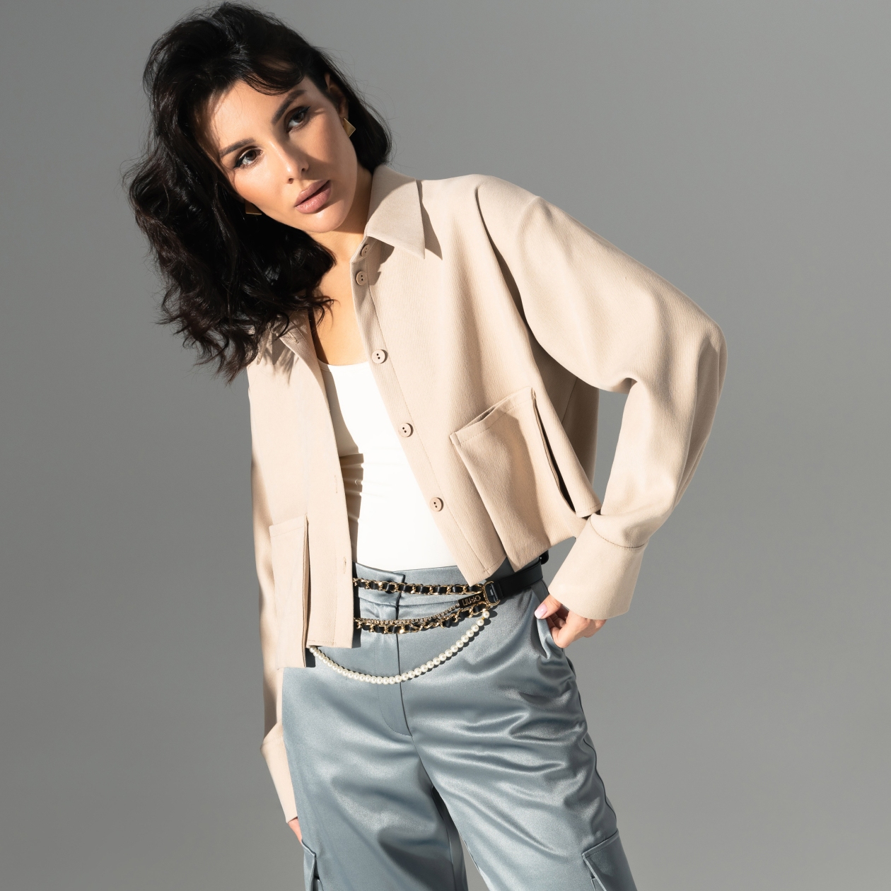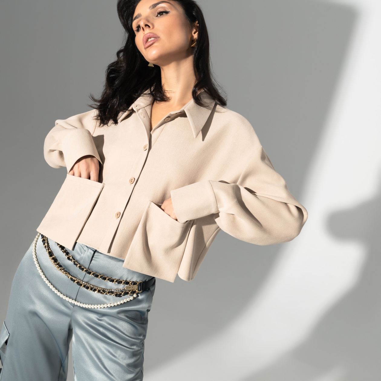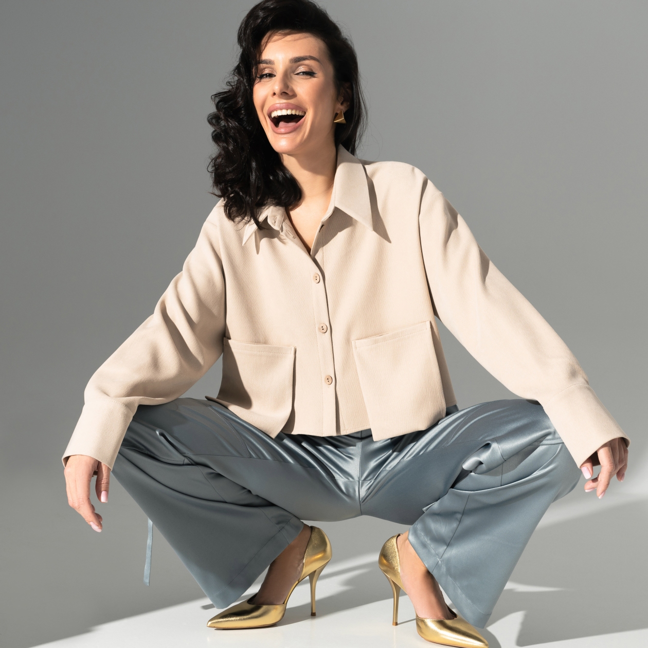 Будем честны, рубашка в оттенке «античный белый» – одна из самых желанных вещей этого сезона. Кроп-длина и накладные карманы – все актуальные тренды в одном изделии.