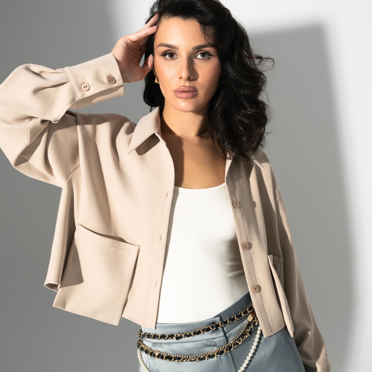 Рубашка «Современная индивидуальность (beige)» – это квинтэссенция элегантности и практичности, предлагающая комбинацию стиля и комфорта. Купите эту рубашку оптом и порадуйте ваших клиентов незабываемой возможностью всегда выглядеть на высоте. Сшитая из костюмной ткани «поливискоза», она не только изысканно выглядит, но и обеспечивает непревзойденную надежность в носке. Это идеальный выбор для тех, кто хочет подчеркнуть свою индивидуальность и особенный шарм в любом окружении, будь то деловая встреча или неформальное мероприятие. Кроп-длина и накладные карманы создают уникальную эстетичную форму, что делает рубашку востребованным продуктом для модных показов и коллекций.