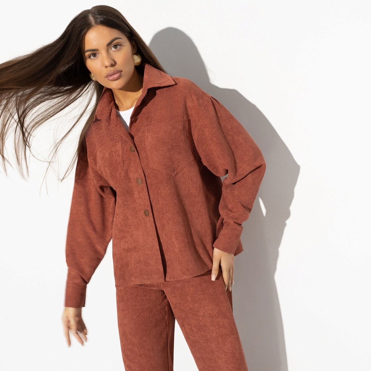 Ты добавила в свое резюме пункты о том, что стильно выглядишь и широко улыбаешься. И сразу получила несколько выгодных предложений! Это ценность мягких навыков. На собеседование надевай рубашку CHARUTTI в терракотовом цвете. Свободный крой, есть карманы. Застегивается на пуговицы. Превосходный вельвет!