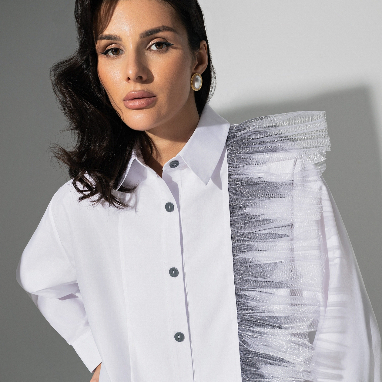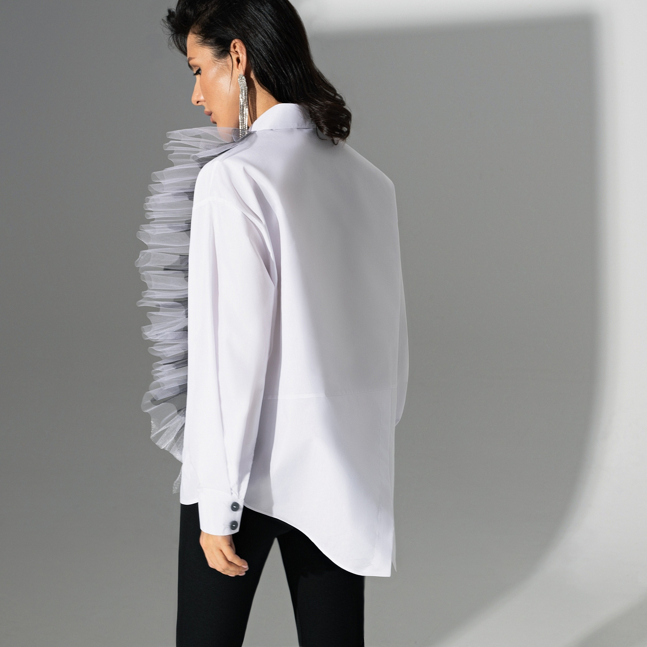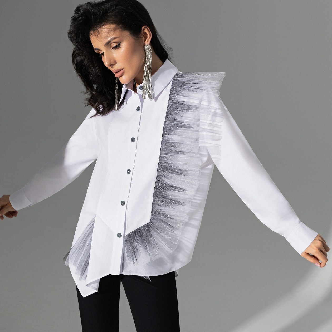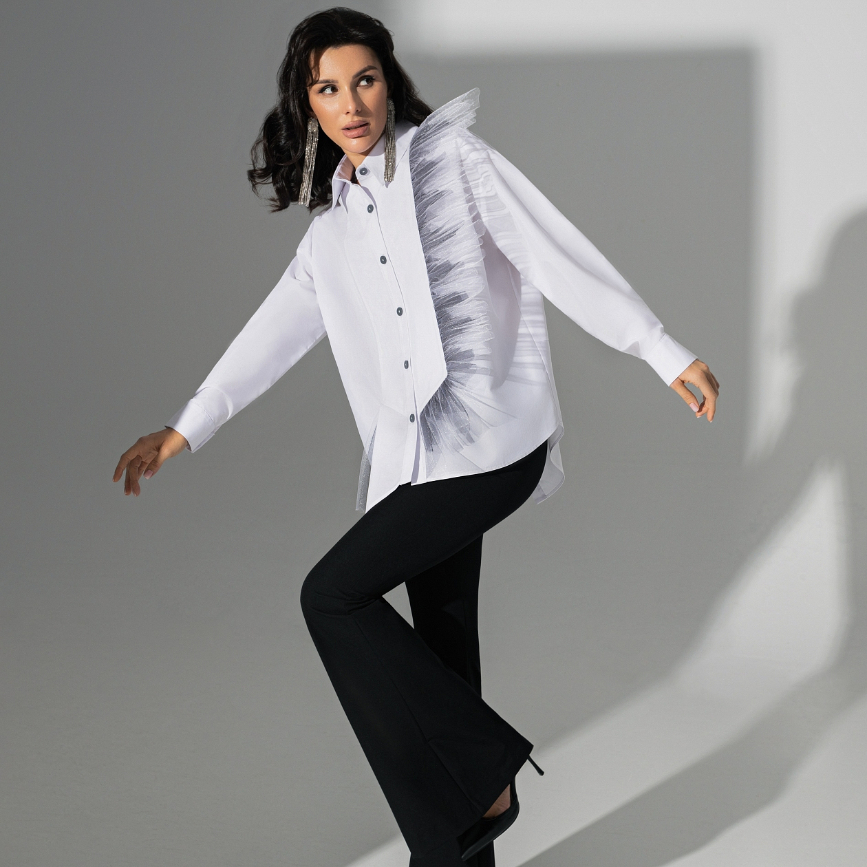 Когда захотела сразить всех новым образом! Белоснежная рубашка PREMIUM – микс строгости и безудержной энергии творчества. Асимметрия и шикарный градиентный волан – дерзко и стильно.