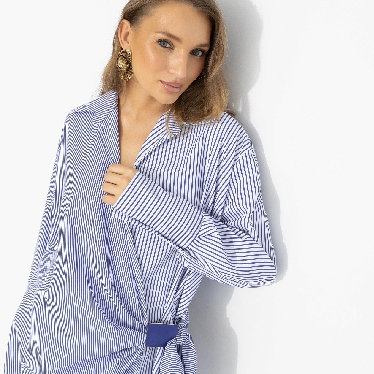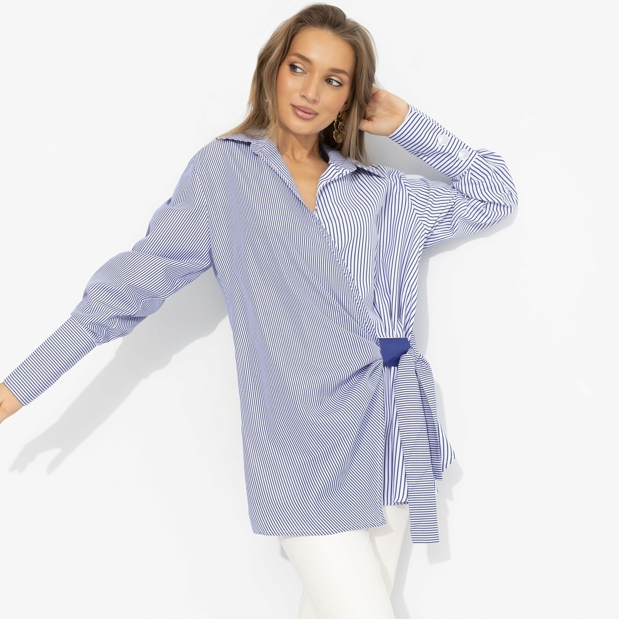 Она не старается быть первой – у неё это получается автоматически. Как у Зендеи на пресс-турах к новому фильму: свежо, умно, с лёгкой игрой на контрастах. Асимметричный крой привлекает внимание, голубая полоска добавляет шика, свободный объём делает силуэт современным и чуть дерзким. Мягкая линия плеча, акцентные манжеты – и вот ты уже не в образе, а в своей главной роли.