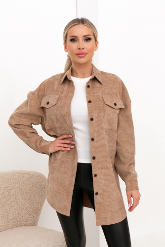 Стильная удлиненная рубашка свободного кроя из ткани - вельвет. Длинный рукав со спущенным плечом оканчивается притачной манжетой. Классический воротник на стойке переходящий в планку с застежкой на петли и пуговицы. Перед дополнен накладными карманами с клапаном. Тканевый пояс создаст акцент на талии. Низ фигурный.