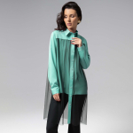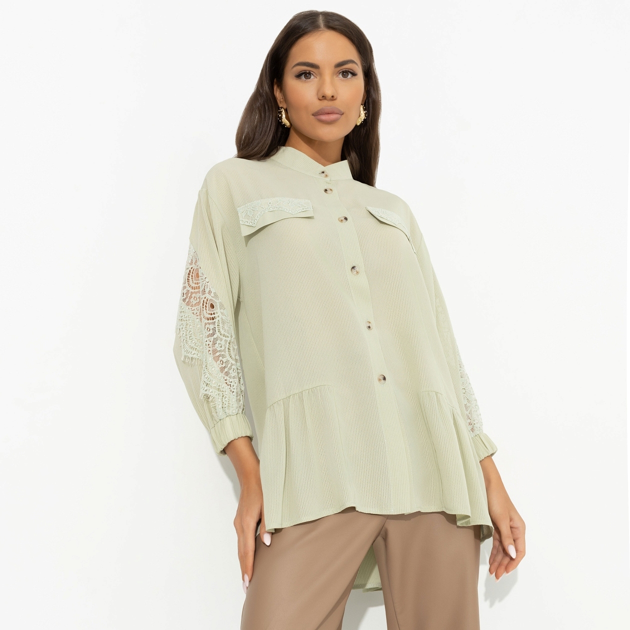 Фисташковая нежность и свобода кроя – эта блуза творит настоящую модную магию! Надела – и сразу +100 к харизме, +200 к элегантности. Волшебство? Нет, просто CHARUTTI. Pубашка свободной посадки. Изделие дополнено тонким вшитым кружевом по спинке и по рукавам. Воротник-стойка. Рукава оформлены скрытыми резинками. Имитация карманов по передней стороне изделия. Рубашка застегивается на пуговицы.