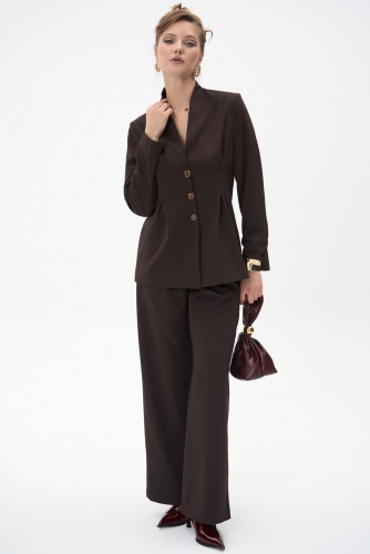 Прямой лаконичный крой брюк подчёркивает игру драпировок и создаёт сбалансированный силуэт. Такой комплект выглядит продуманно, современно и при этом остаётся комфортным в носке — от офиса до ужина в городе.