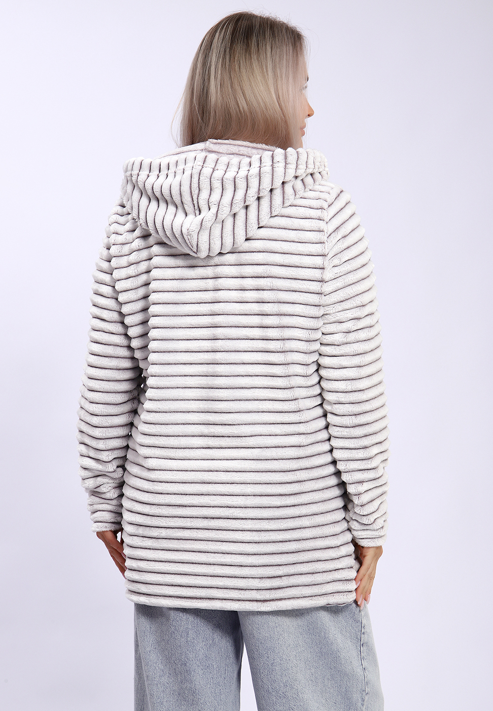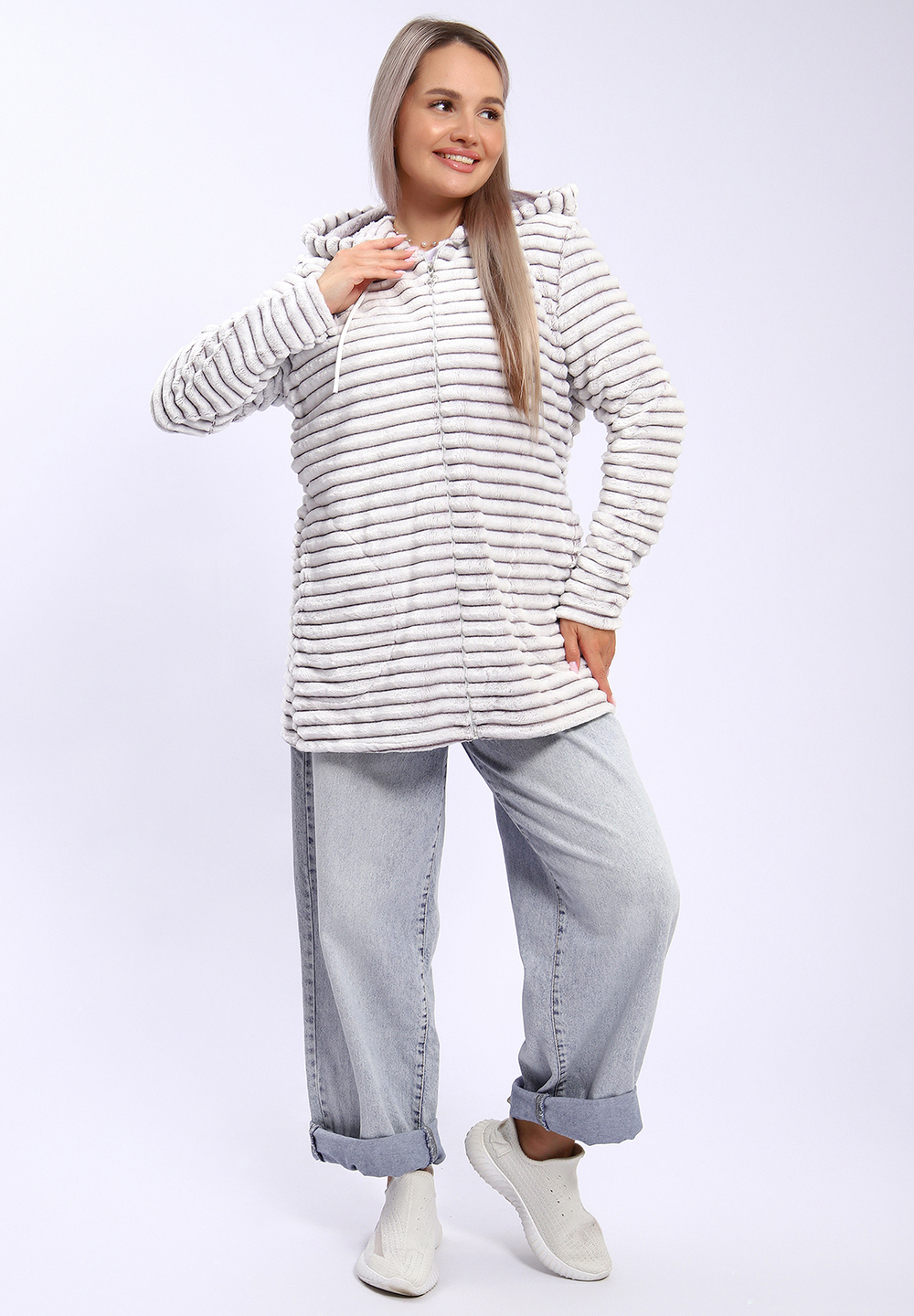 Толстовка с капюшоном на молнии и двумя карманами выполнена из мягкого и теплого велсофта, похожего на шиншиллу. Удлиненная модель обеспечивает дополнительное тепло и комфорт, идеально подходит для холодных дней. Мягкая текстура и приятное ощущение на ощупь делают эту толстовку стильным и уютным элементом гардероба. Цвет: белый; Материал: велсофт;велсофт; Состав: п/э 100%.