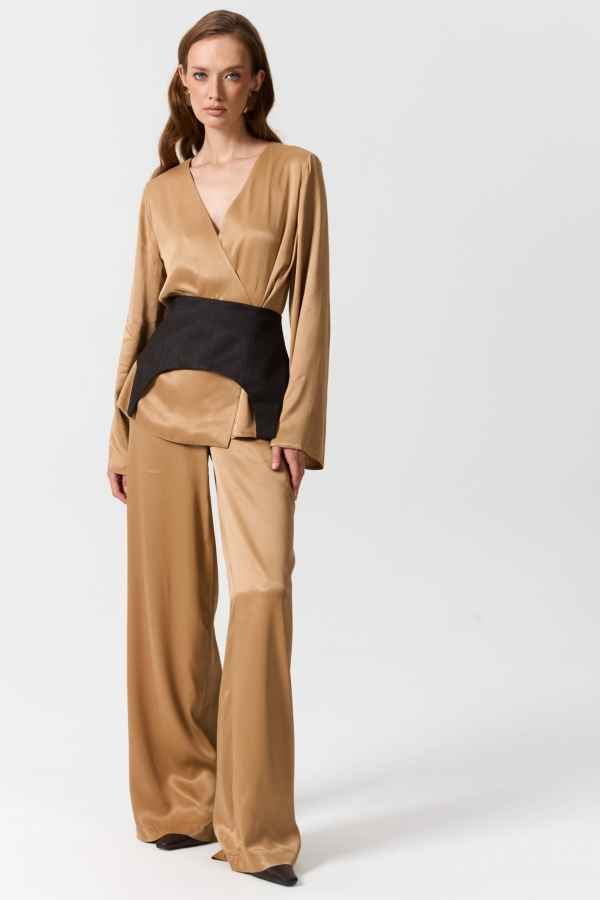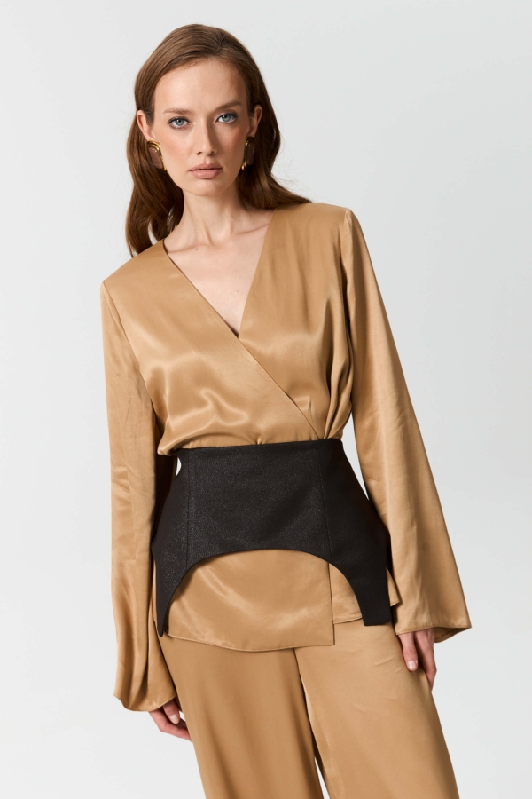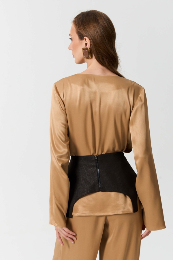 Пояс-баска из костюмного полотна с шиммером. Модель полуприлегающего силуэта с фигурным низом. Застежка на акцентную молнию по спинке. Изделие на поливискозном подкладе в тон.