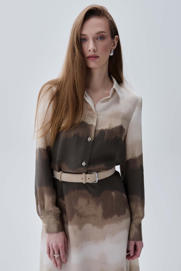 Платье из вискозного полотна, полуприлегающего силуэта. По переду застежка на петли и пуговицы. Рукав длинный оформлен манжетой с застежкой. В комплекте пояс из основной ткани.