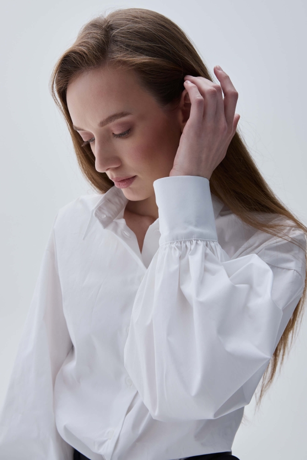 Рубашка из хлопка с объемным рукавом. Свободная модель со спущенной линией плеча. Рукава расширены к низу на манжете, воротник рубашечный на стойке. Застежка на пуговицы и петли.