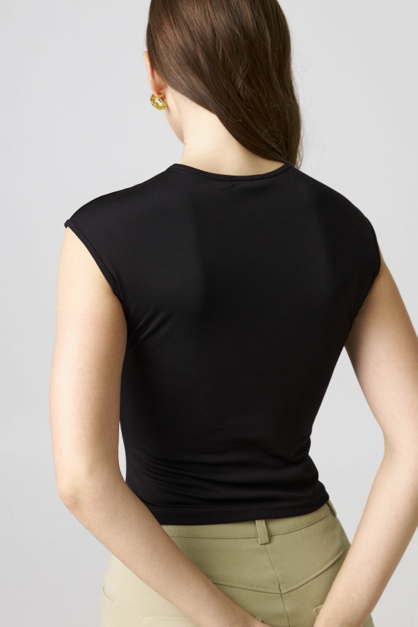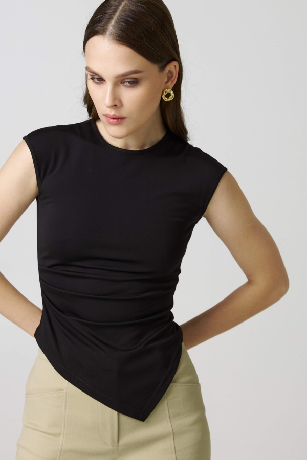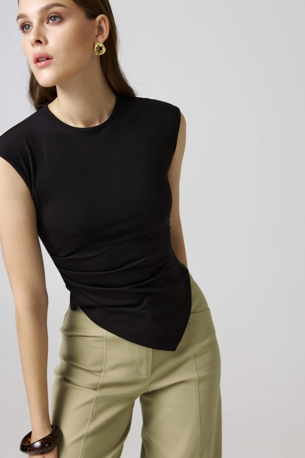 Стильный топ из вискозного трикотажа. Модель прилегающего силуэта с ассиметричным низом. Круглый вырез. Спущенная линия плеча. Защипы по боковому шву.