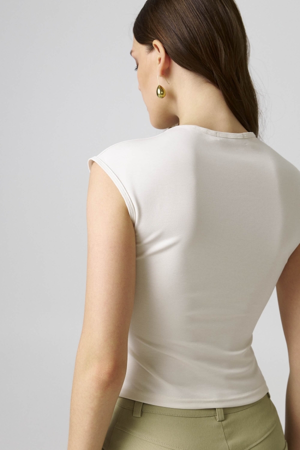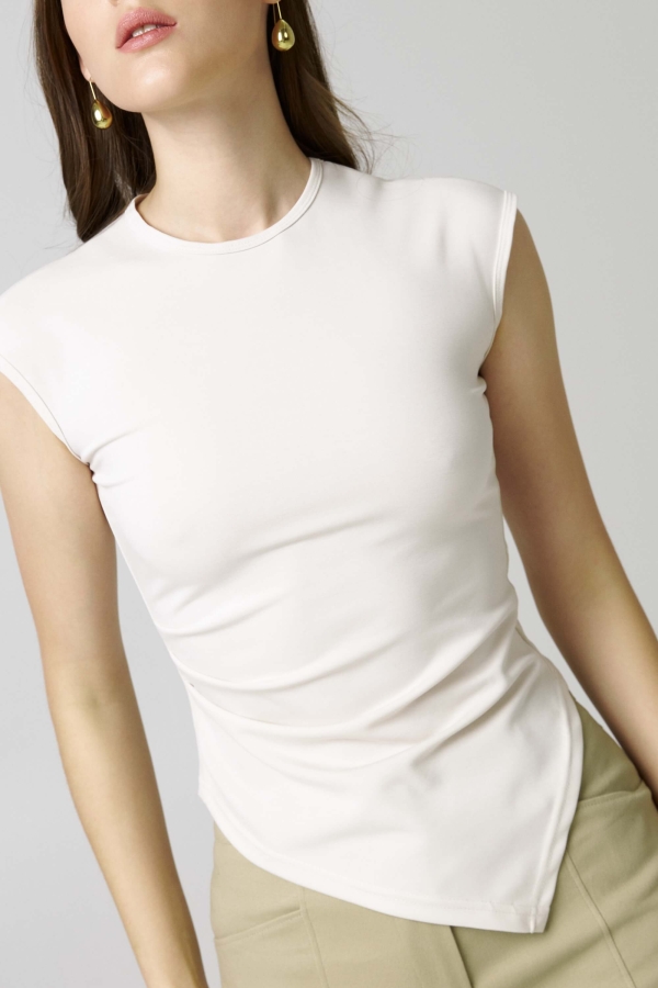 Стильный топ из вискозного трикотажа. Модель прилегающего силуэта с ассиметричным низом. Круглый вырез. Спущенная линия плеча. Защипы по боковому шву.
