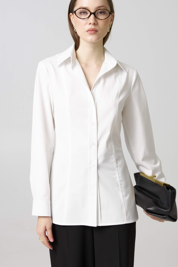 Стильная рубашка из шелковистой вискозы. Модель приталенного силуэта. Рубашечный воротник. Втачной рукав. По переду и спинке рельефные швы. Фигурная линия низа.