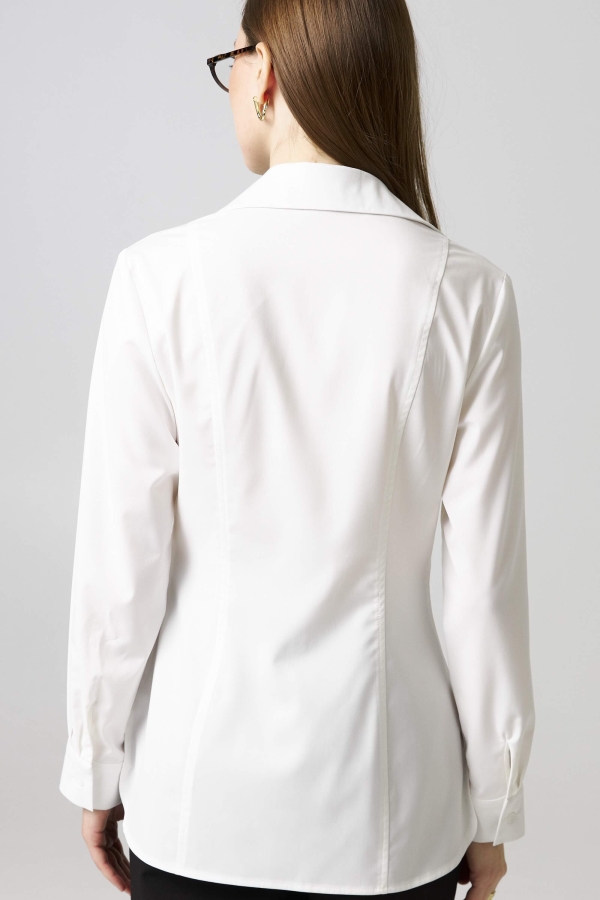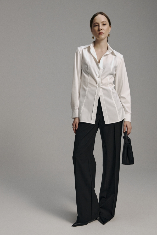 Стильная рубашка из шелковистой вискозы. Модель приталенного силуэта. Рубашечный воротник. Втачной рукав. По переду и спинке рельефные швы. Фигурная линия низа.