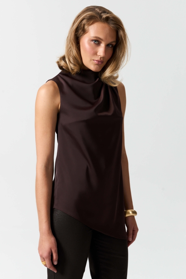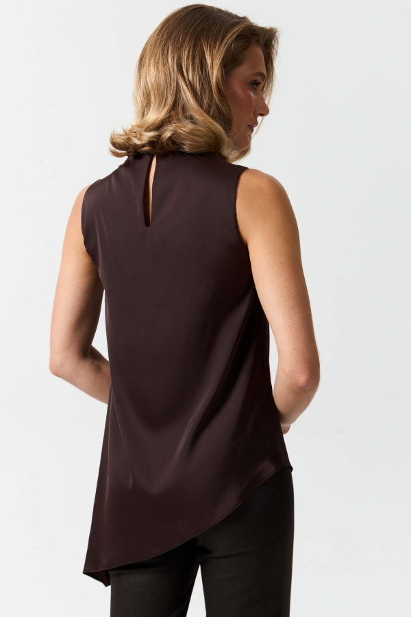 Топ асимметричного кроя из атласа высокого качества. Модель свободного силуэта. По переду декоративные складки, переходящие в стойку. По спинке застежка на петлю и пуговицу. Низ изделия ассиметричный.