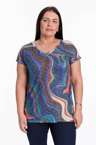 Женская футболка выполнена из однотонной кулирки с лайкрой. С коротким рукавом и круглым вырезом горловины, оформленным планкой. Спереди нанесён принт.
