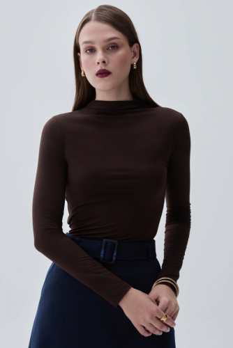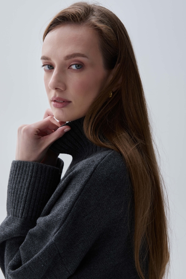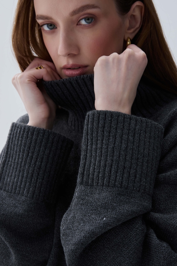 Базовый свитер из шерсти. Модель свободного силуэта. Рукав спущенный. Воротник- стойка. Резинка на рукавах и по низу изделия.