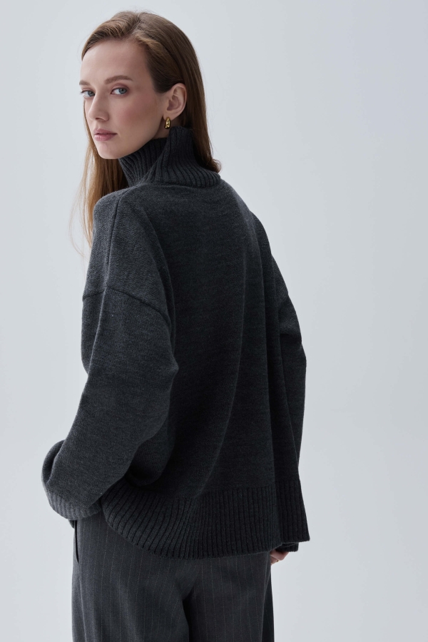 Базовый свитер из шерсти. Модель свободного силуэта. Рукав спущенный. Воротник- стойка. Резинка на рукавах и по низу изделия.