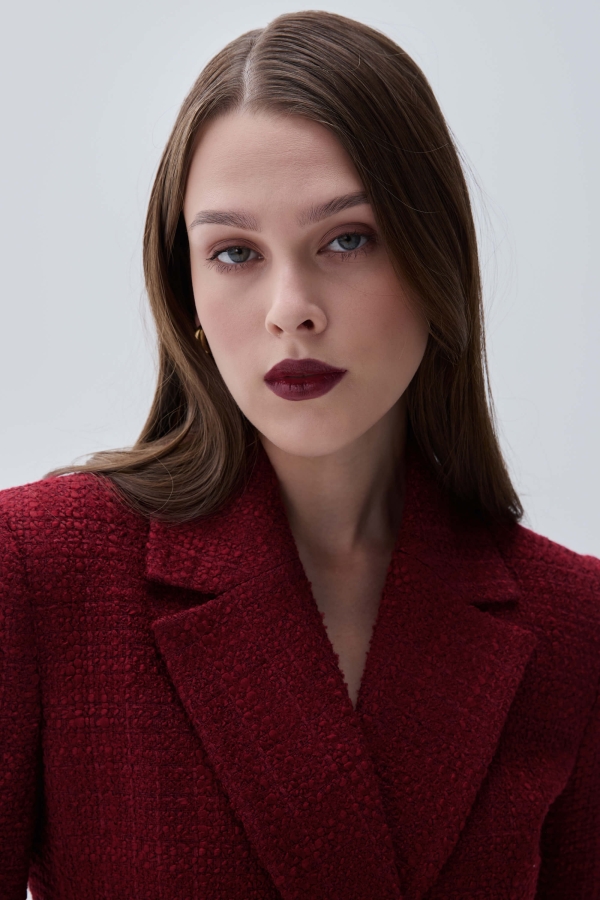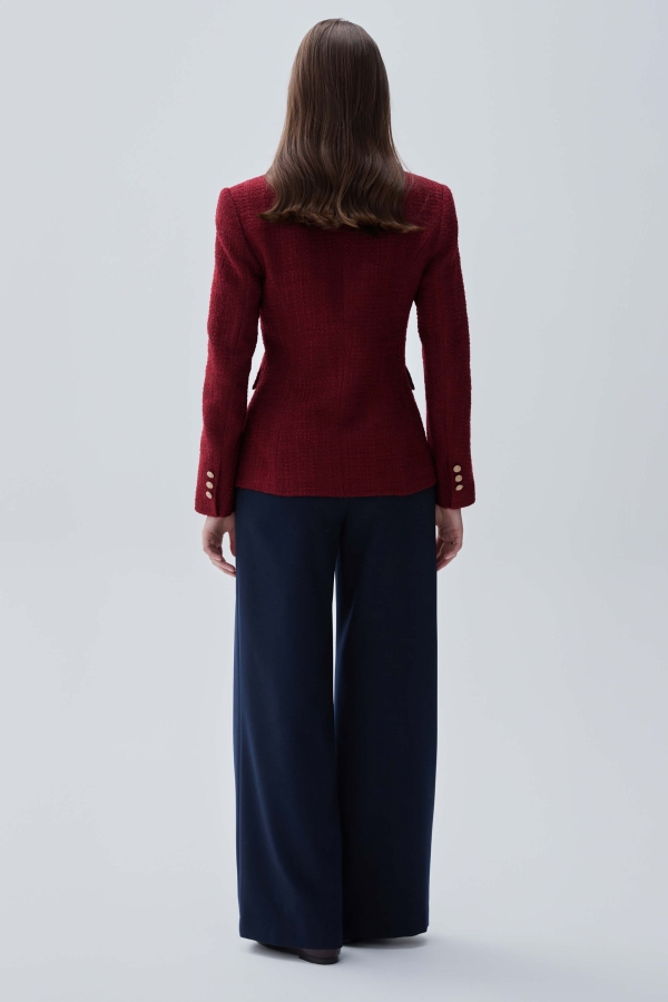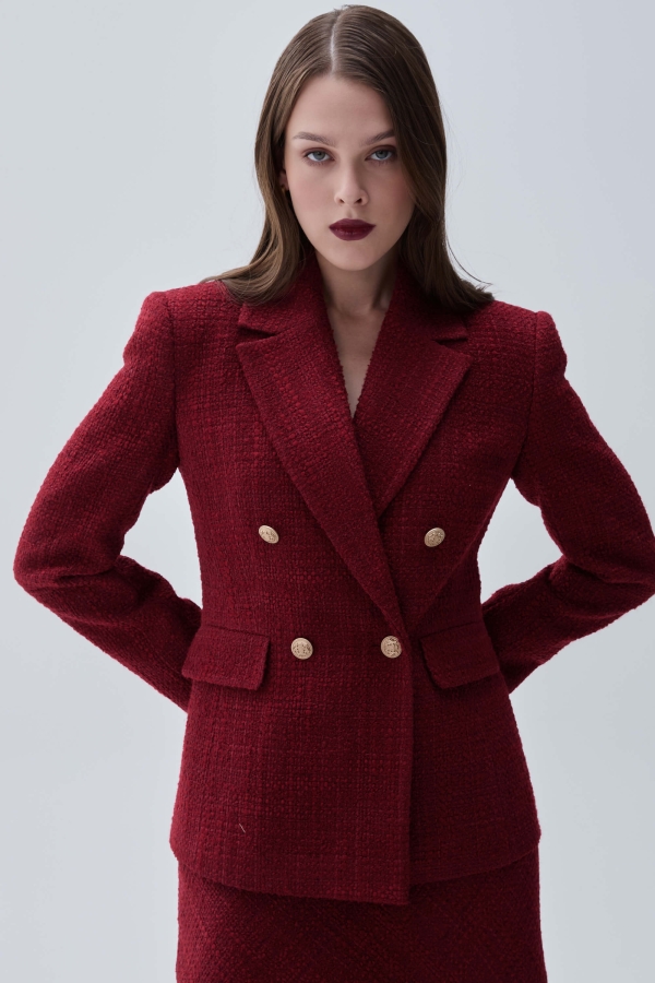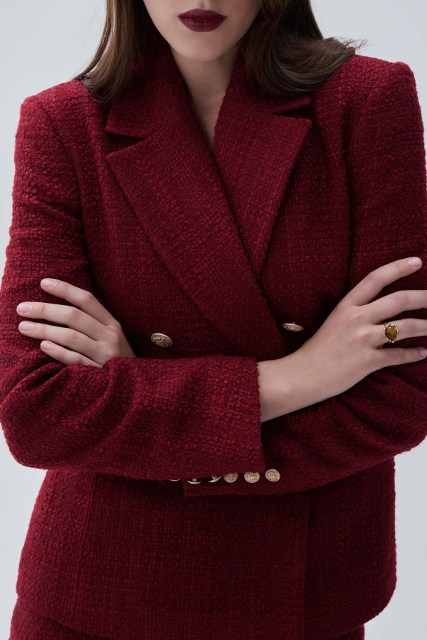 Жакет из твида в трендовом оттенке. Модель полуприлегающего силуэта с двубортной застежкой на акцентные пуговицы. По переду декоративные клапана и прорезные карманы. Воротник английский. Втачной рукав. Изделие на подкладке.