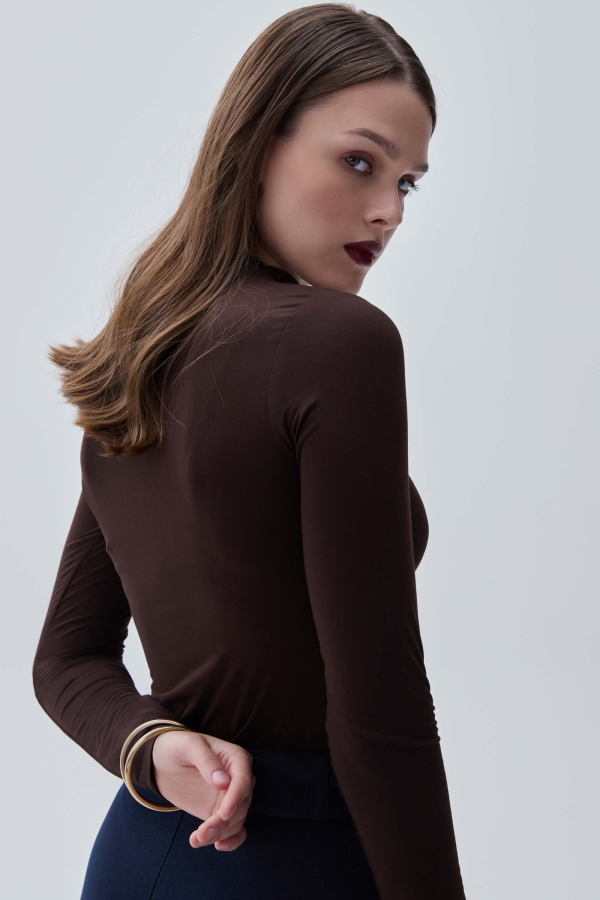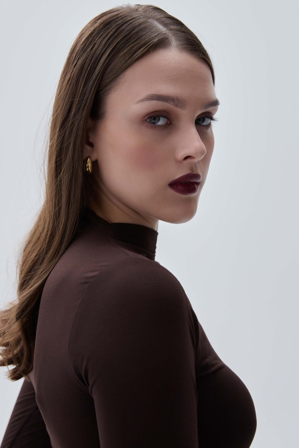 Базовый лонгслив из трикотажного вискозного полотна. Прилегающий силуэт, рукав втачной. Горловина цельнокроенная на стойке.