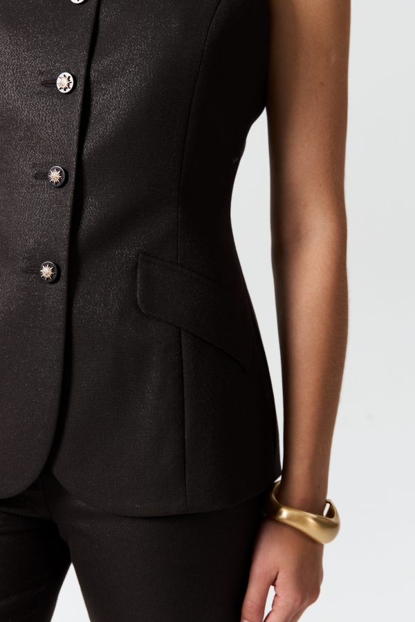 Женственный жилет с акцентными пуговицами. Модель полуприлегающего кроя с рельефами, вытягивающими силуэт. По переду функциональная застежка на петли и пуговицы. Декоративные клапанами. Изделие на поливискозном подкладе в тон.