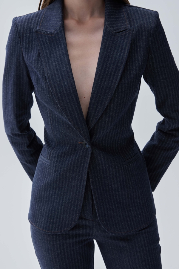 Жакет из денима прилегающего силуэта. Силуэт приталенный, воротник английский. Застежка на пуговицу.