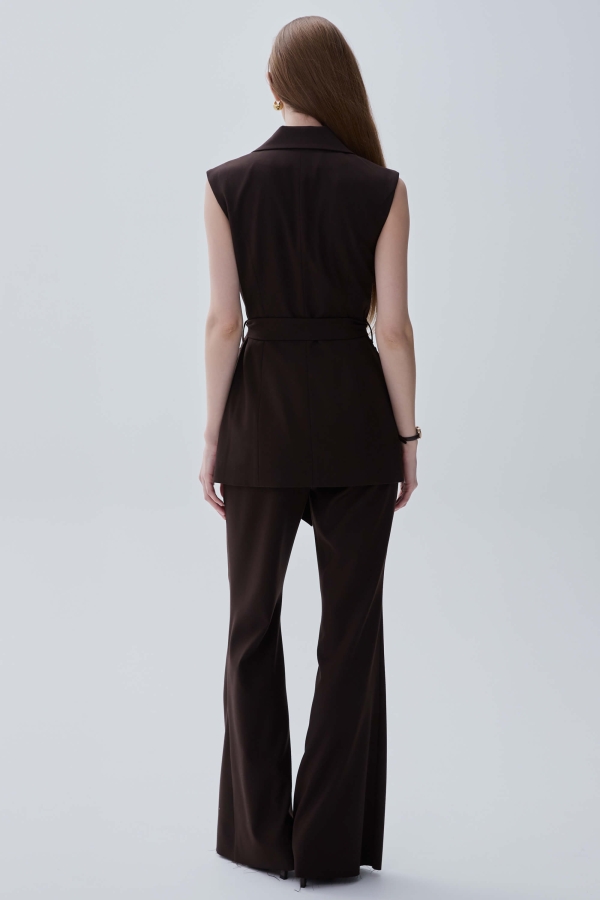 Брюки из костюмного полотна в благородном оттенке. Модель расклешенная к низу на притачном поясе. По переду боковые карманы, стрелки и застёжка-гульфик.