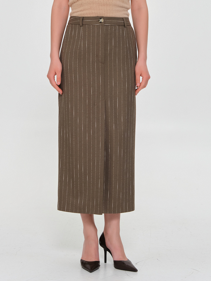 Модель прямого силуэта, на подкладе. Пояс подкройной, со шлёвками. Спинка со средним швом. Спереди карманы в подрезных бочках. Застёжка на молнию и пуговицу на поясе. В среднем шве переда обработана шлица.