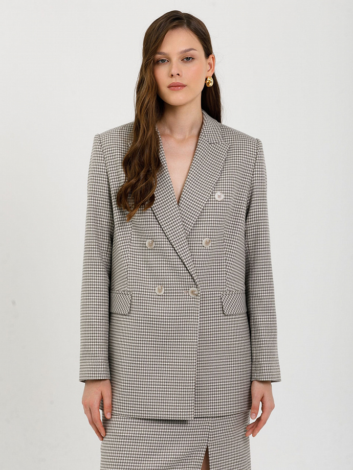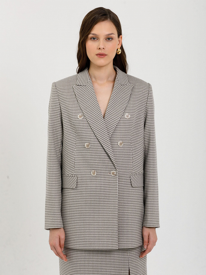 Модель прямого силуэта, на подкладе, с двубортной застёжкой на петли и пуговицы. Спереди прорезные карманы в рамку с клапаном. Средний шов спинки снизу заканчивается шлицей. Воротник пиджачный. По низу рукава отлетная шлица с декоративными петлями и пуговицами.