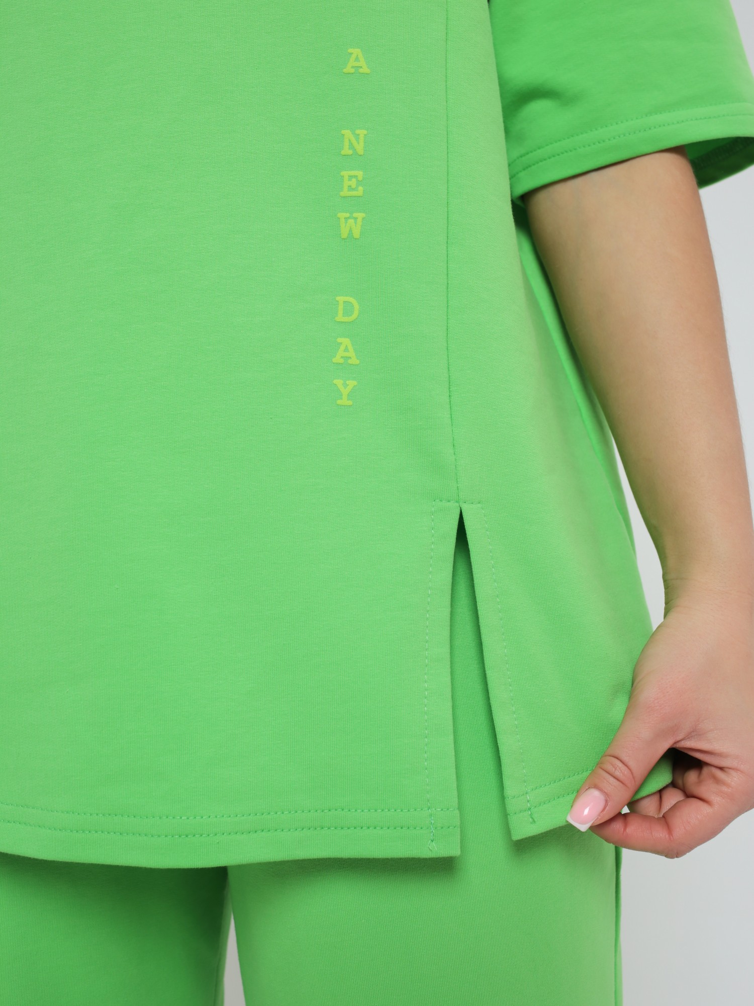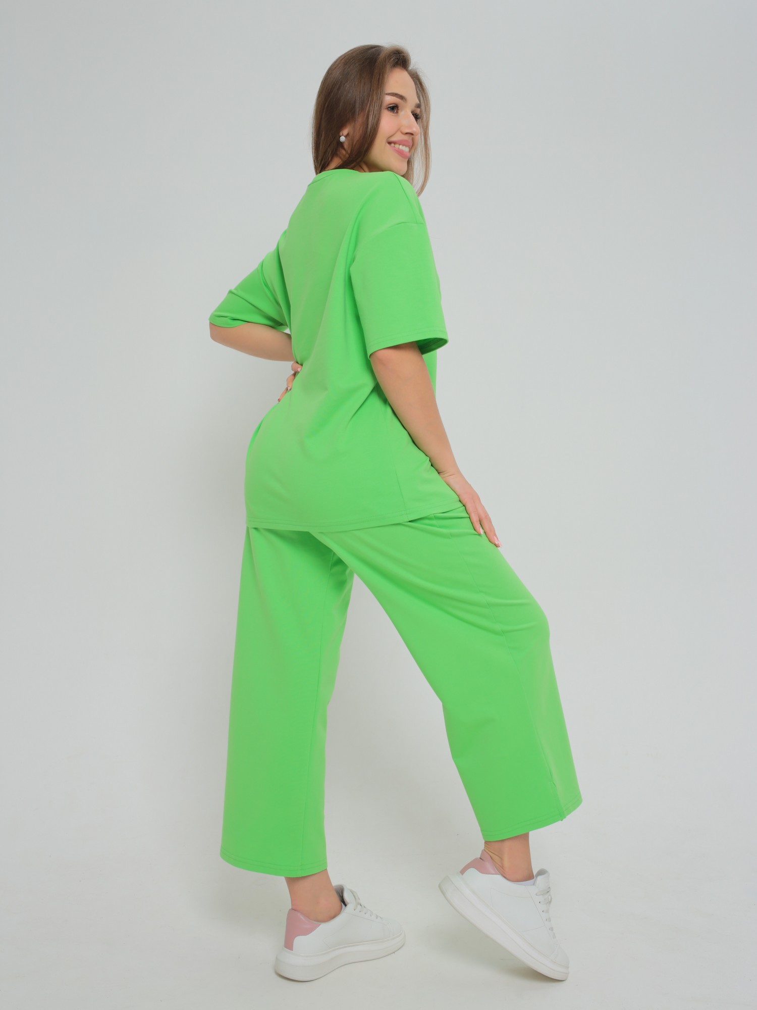 Костюм молодежный из гладкокрашеного трикотажного полотна «футер-двунитка», состоящий из футболки и брюк-кюлотов.